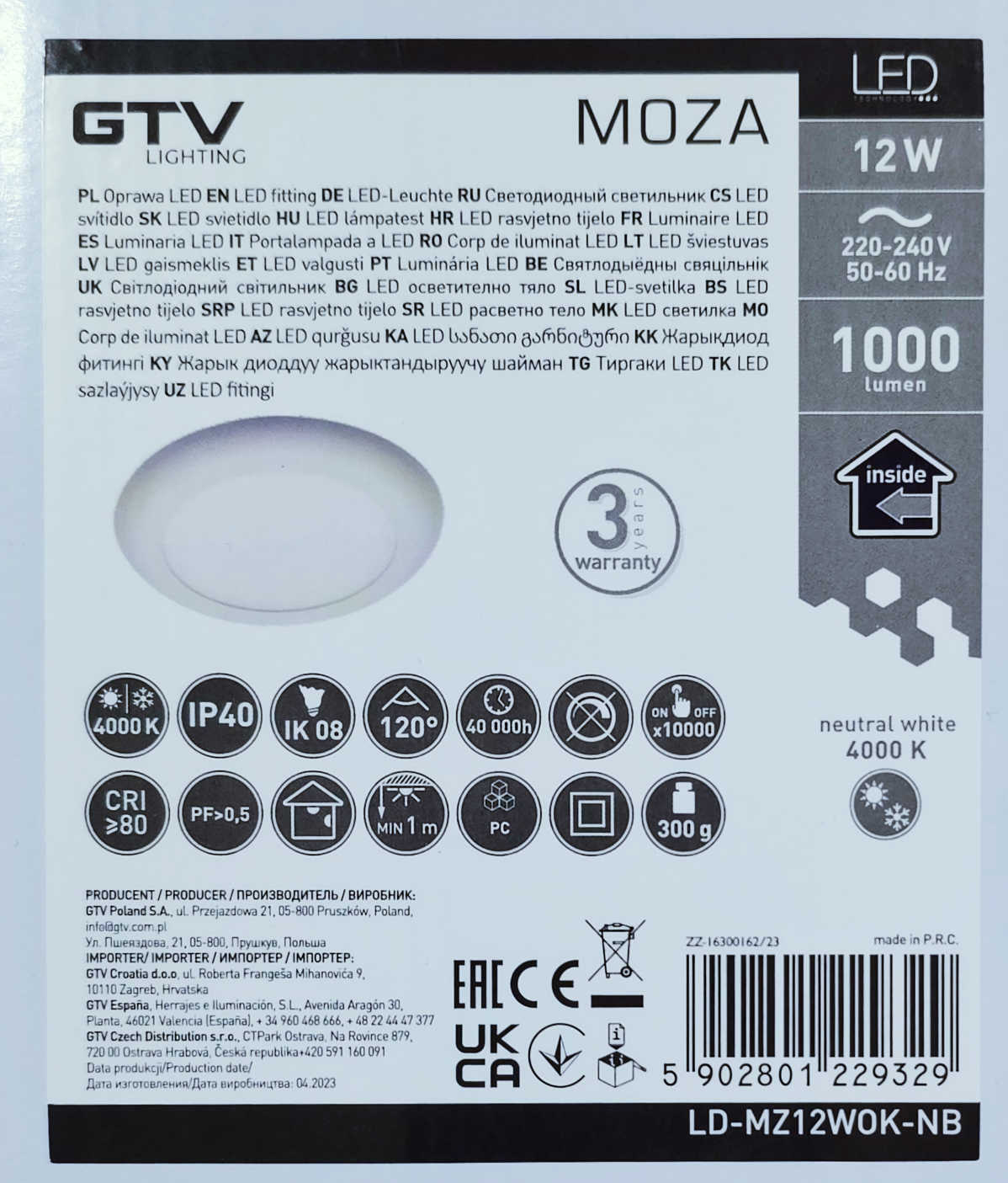 Detali informacija Kodas: 11121, Šviestuvas LED PAV 12W IP40 1000lm 4000K GTV MOZA LD-MZ12WOK-NB (5902801229329)(01080006)