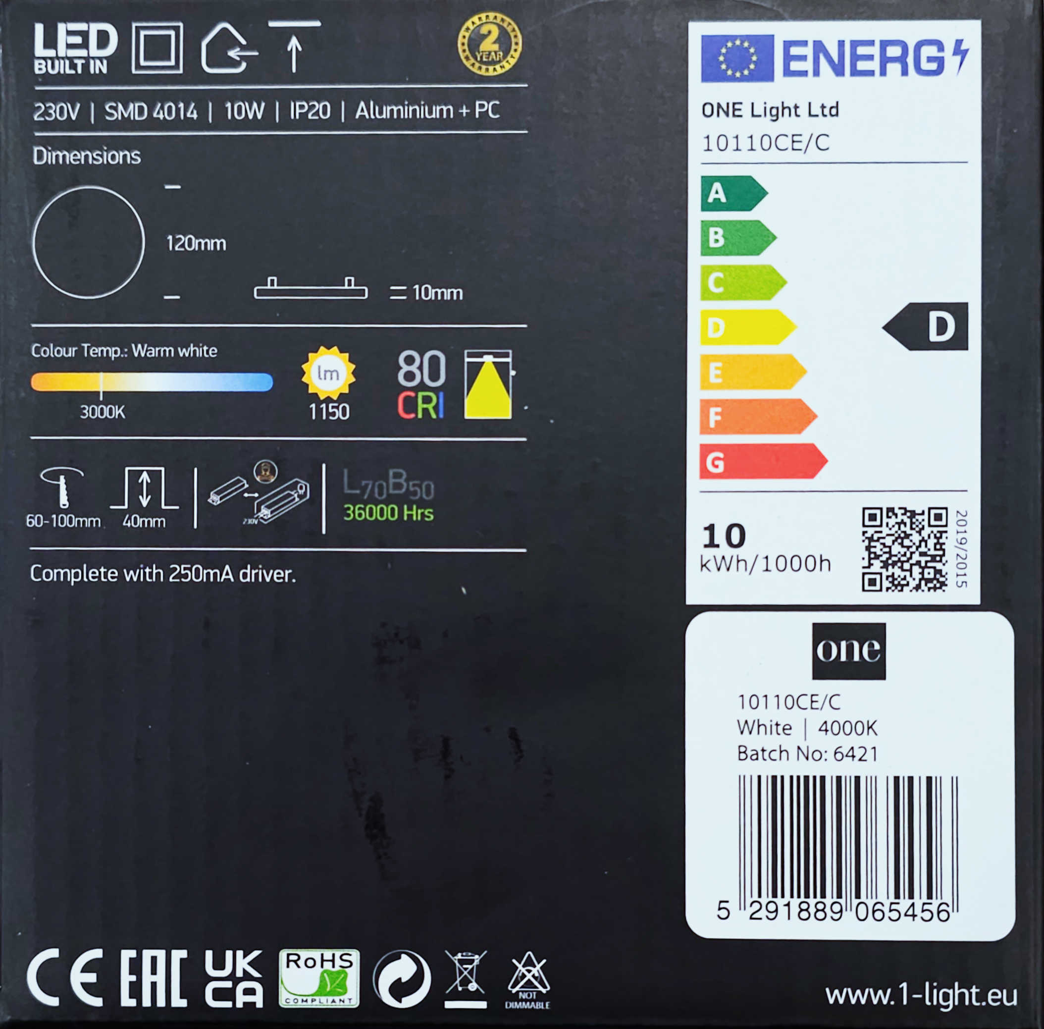 Detali informacija Kodas: 11128, Šviest. LED skydas įl 10W apval D120 1150lm/4000K IP20 10110CE (LED41332) One light