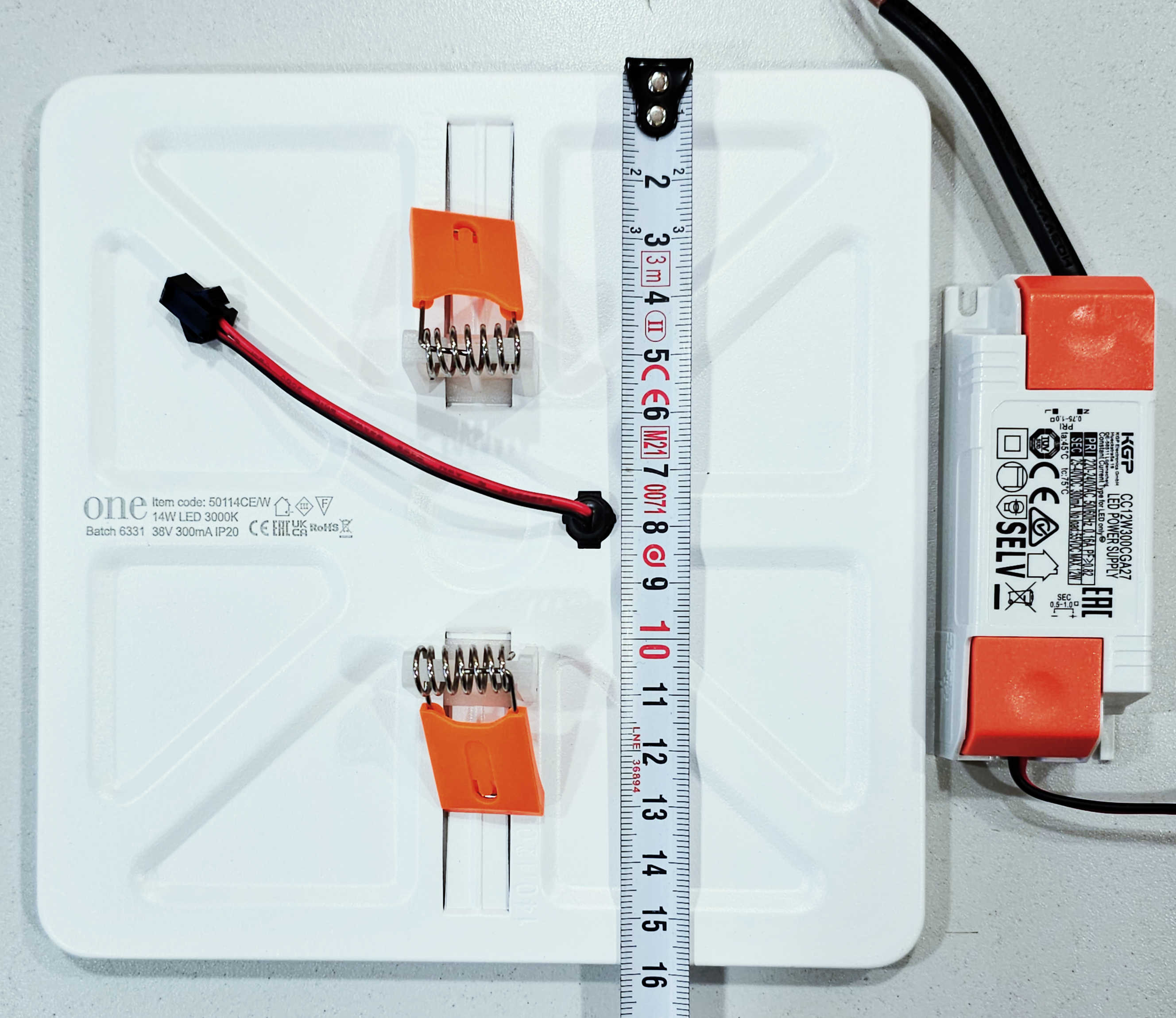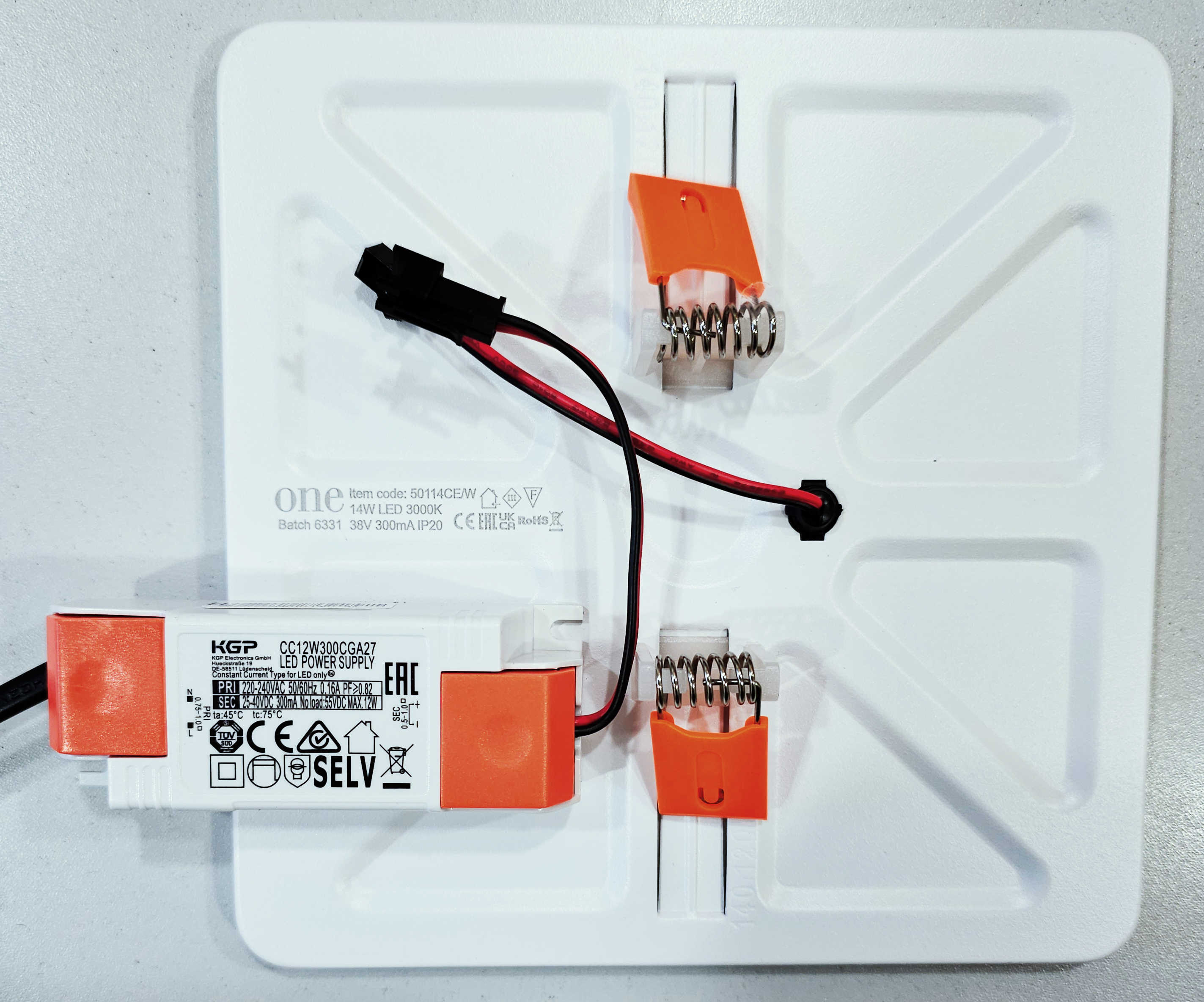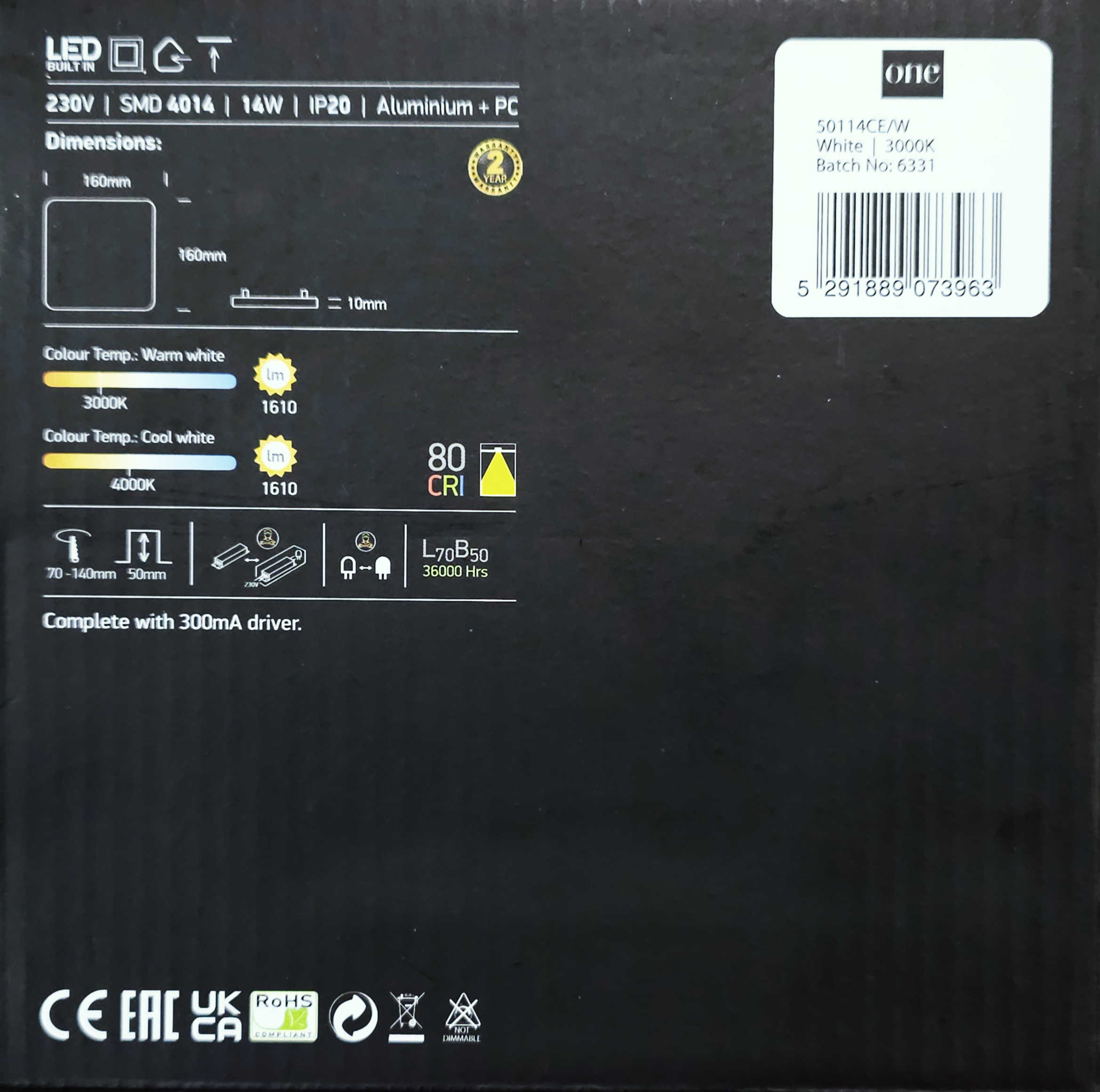 Detali informacija Kodas: 11129, Šviest. LED skydas įl 14W keturk 160X160 SLIM 1610lm/3000K IP20 50114CE (LED41911) One light