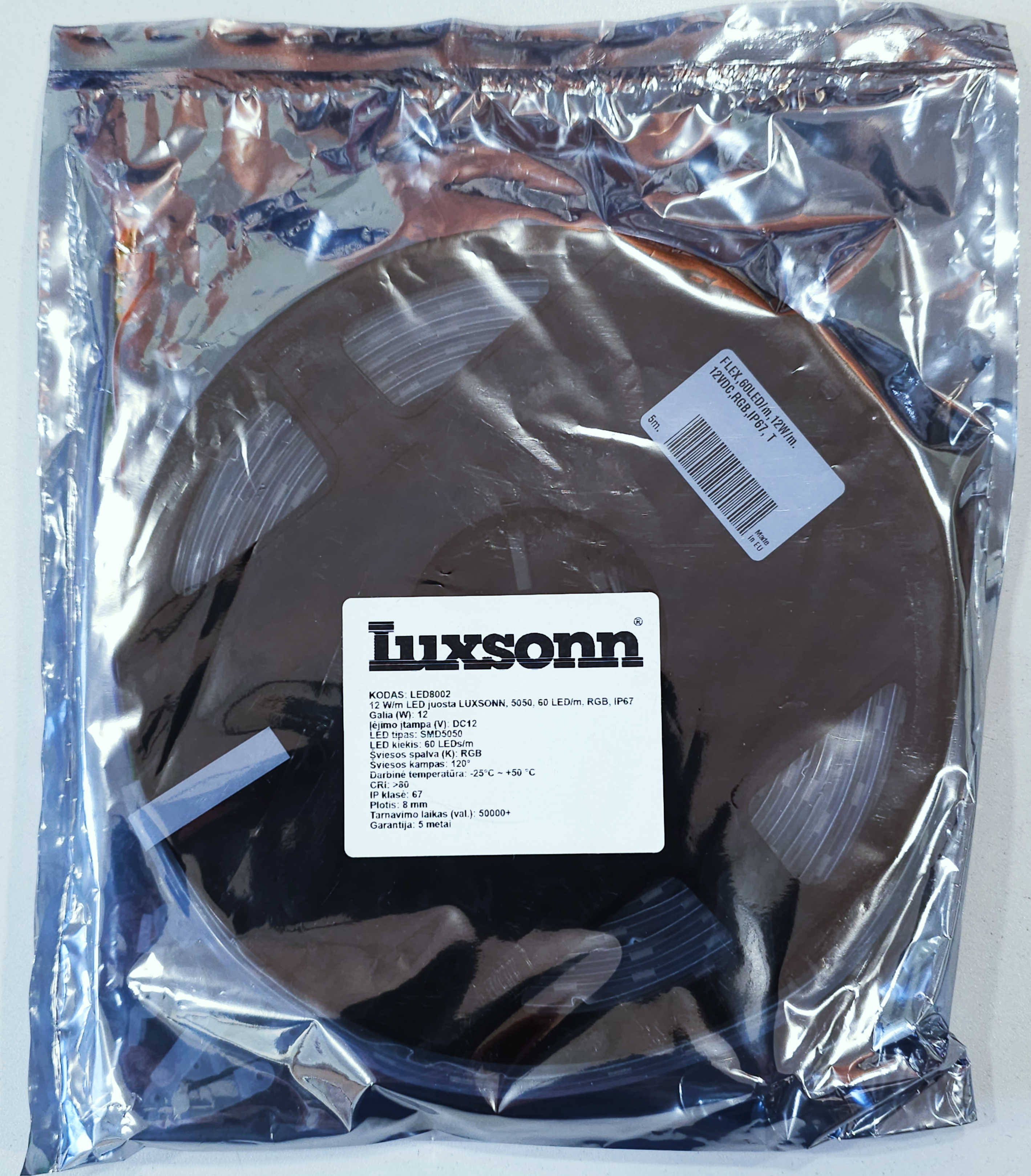 Detali informacija Kodas: 11173, Juosta LED 12W/1m 60LED/m RGB IP67 12V 5050 (LED8002) LUXSONN