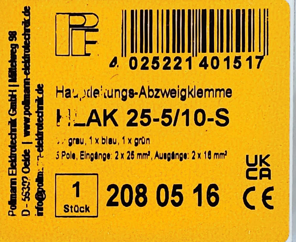 Detali informacija Kodas: 11188, Gnybtas skirst-sujung 5P (3P+N+PE) In: 2x25mm², Out: 2x25mm² HLAK Polimann 25-5/10 S (208.05.16) (4)