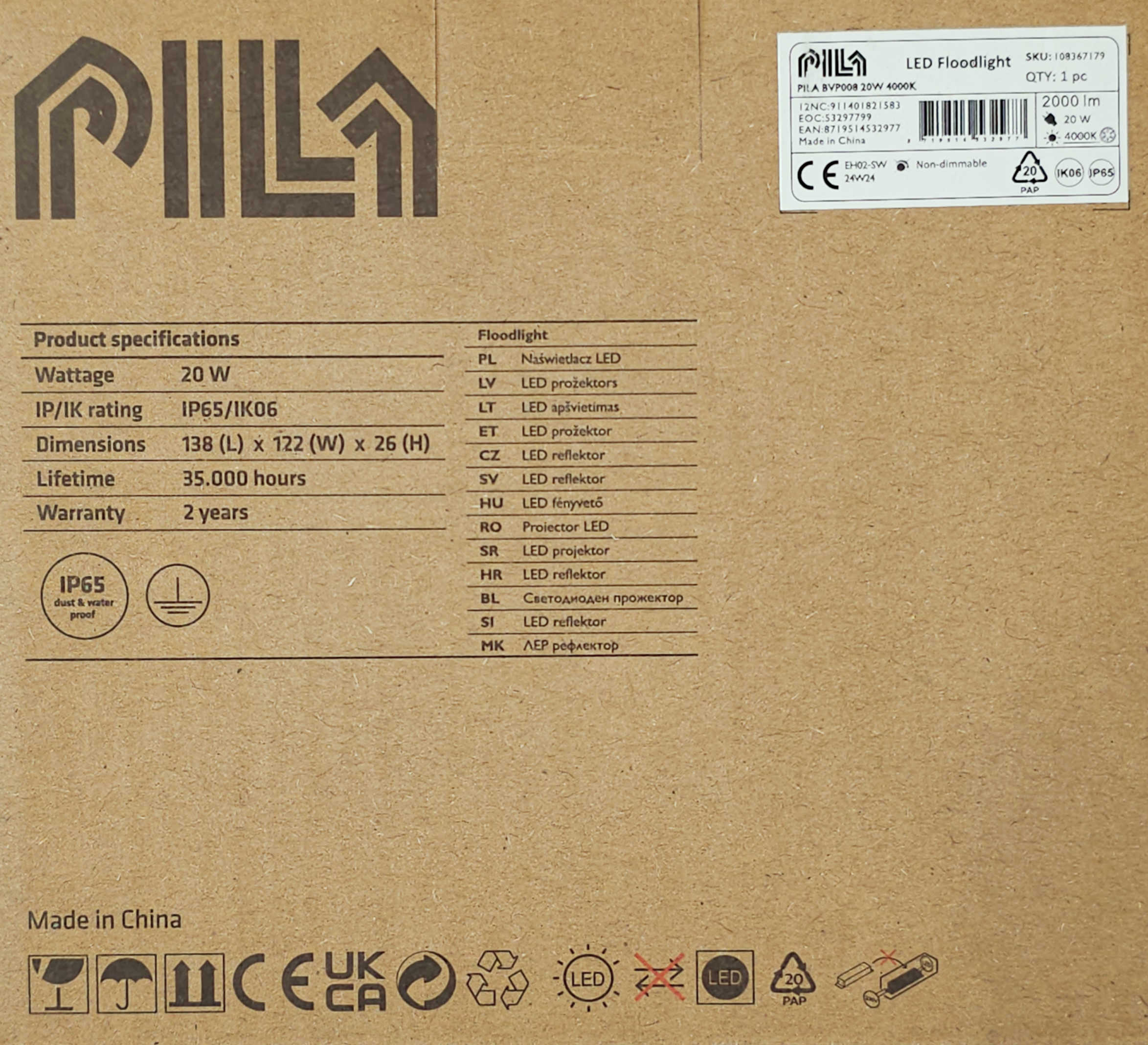 Detali informacija Kodas: 11211, Šviestuvas LED prožekt 20W 4000K 2000lm IP65 BVP008 Pila (911401821583)