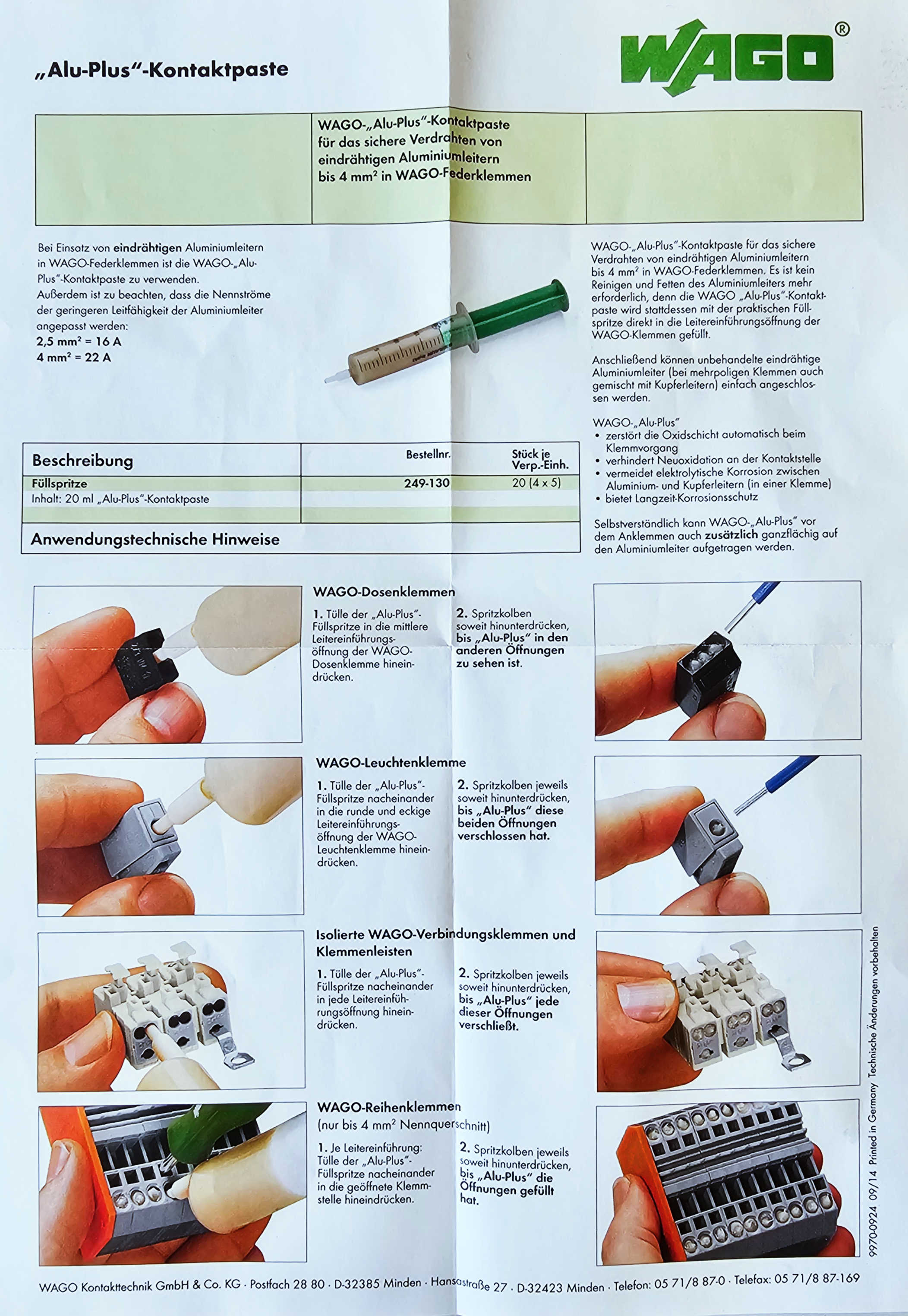 Detali informacija Kodas: 11236, Pasta kontaktinė - antioksidacinė aliuminio laidams Wago 249-130 20 ml švirkšte Alu-plus