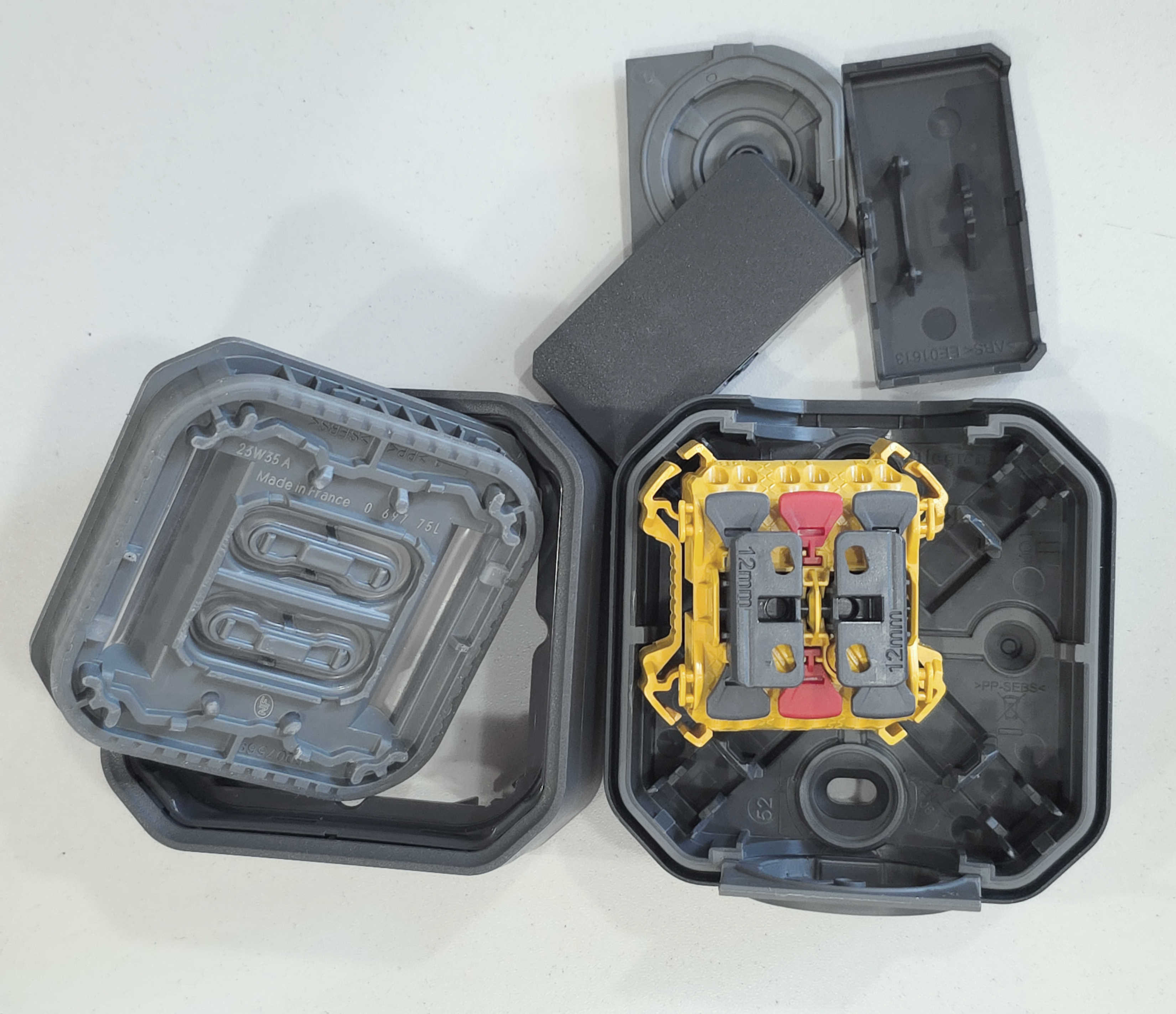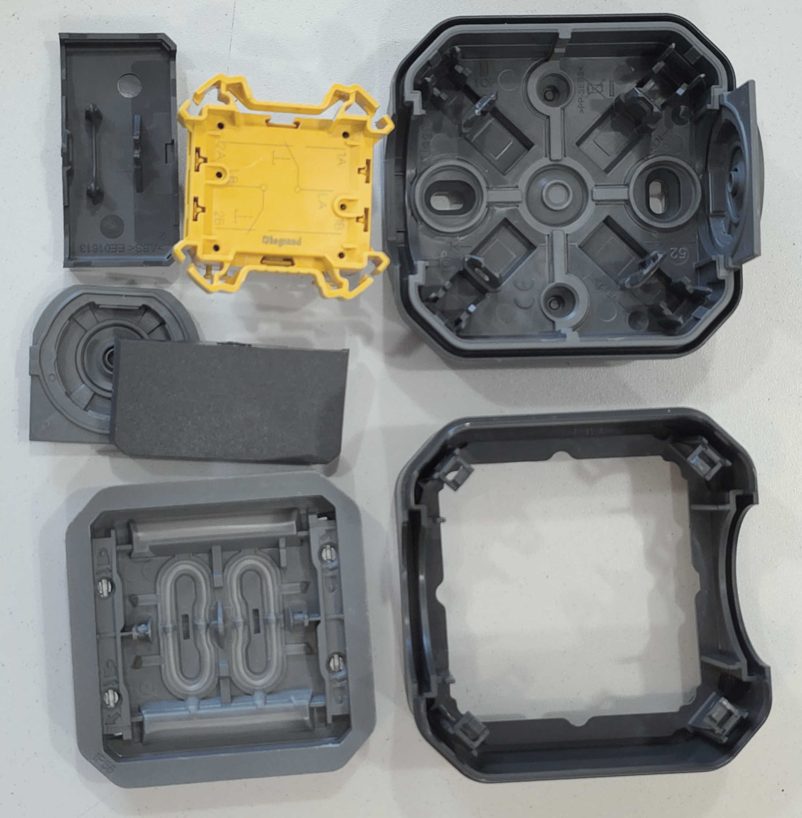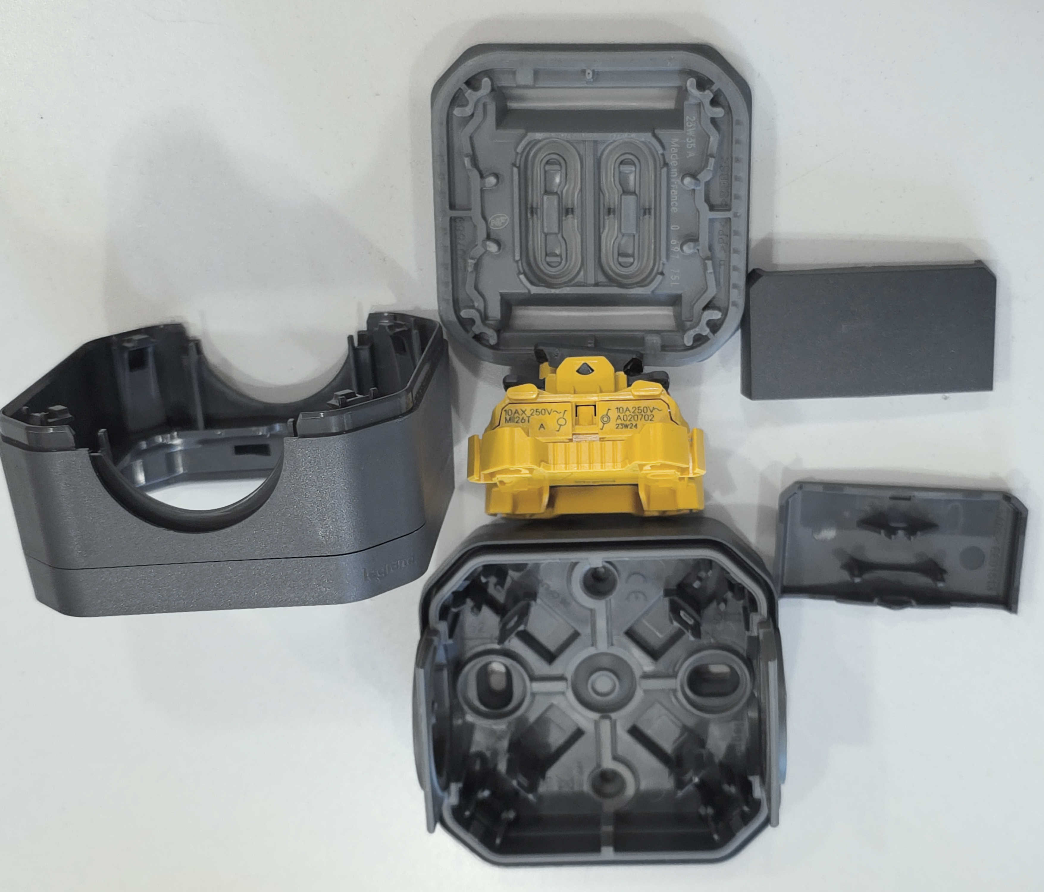 Detali informacija Kodas: 11267, Jungiklis-perjungiklis-impulsinis paviršinis 2P hermetinis IP55 10A/250V antracit Legrand PLEXO (069775L)