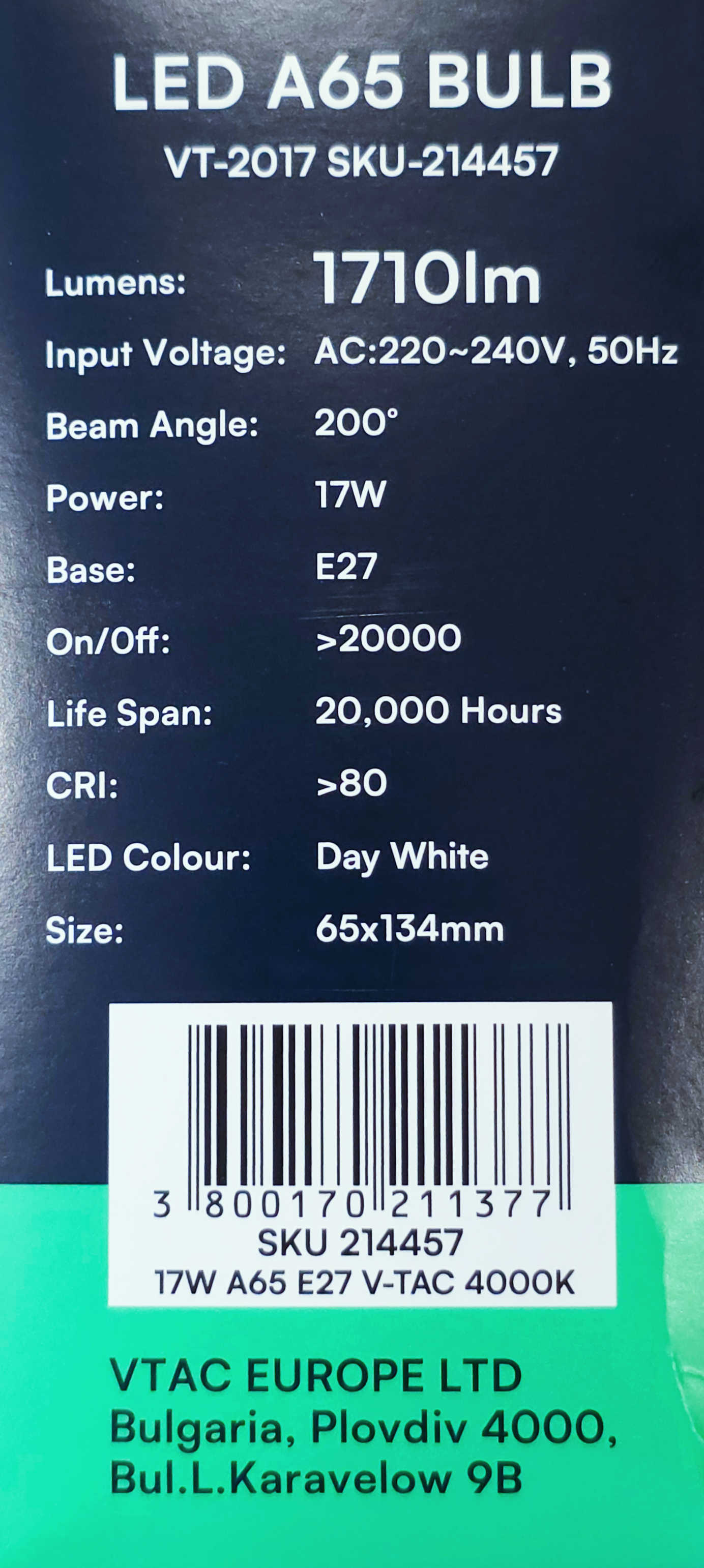 Detali informacija Kodas: 11280, Lempa LED 17W E27 4000K 1710lm (LED93438) SKU-214457 V-TAC