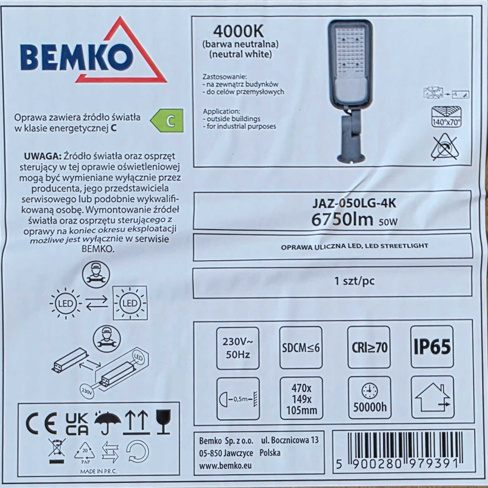 Detali informacija Kodas: 11295, Šviestuvas LED gatv. 50W 6750lm 4000K JAZ-050LG-4K Jazmin Bemko (LED103524)