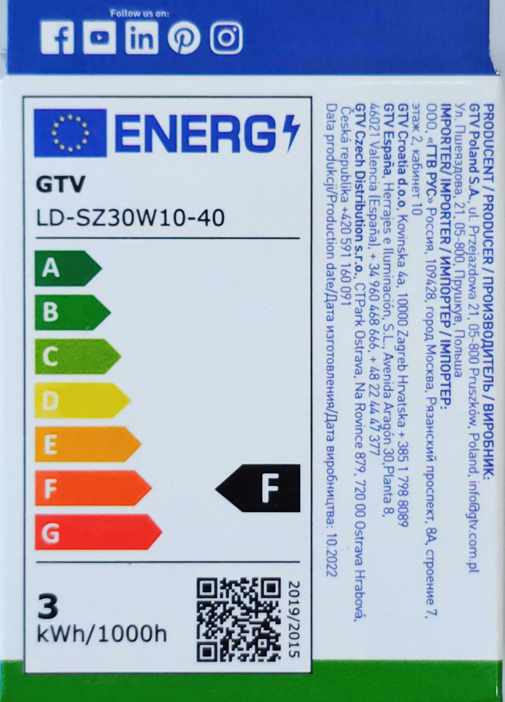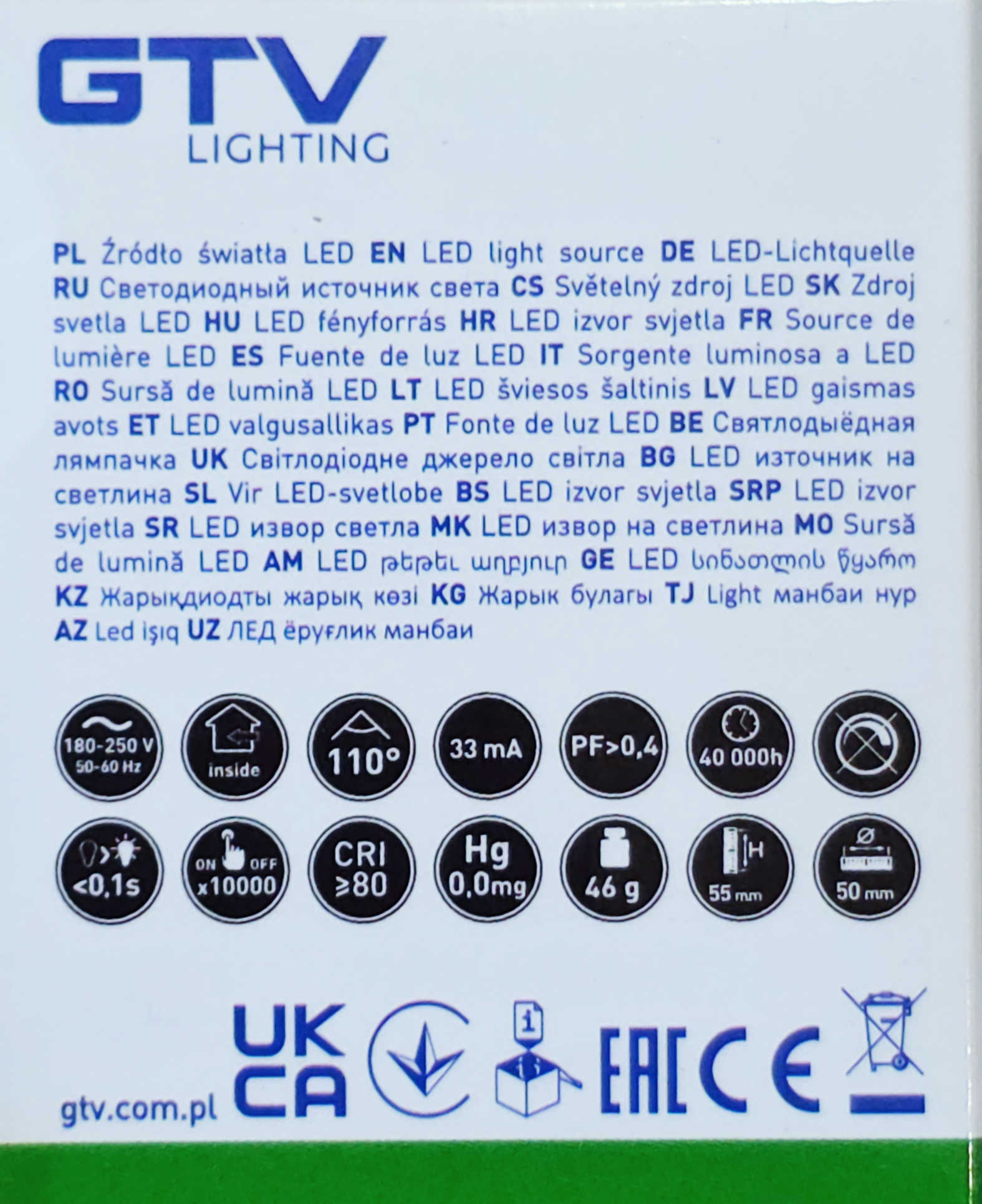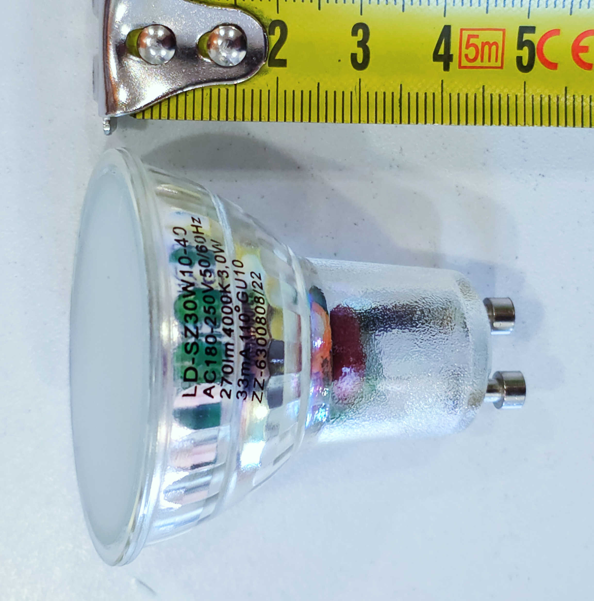 Detali informacija Kodas: 11315, Lempa LED GU10 3W 220V 110° 4000K 270lm Stikl GTV LD-SZ30W10-40