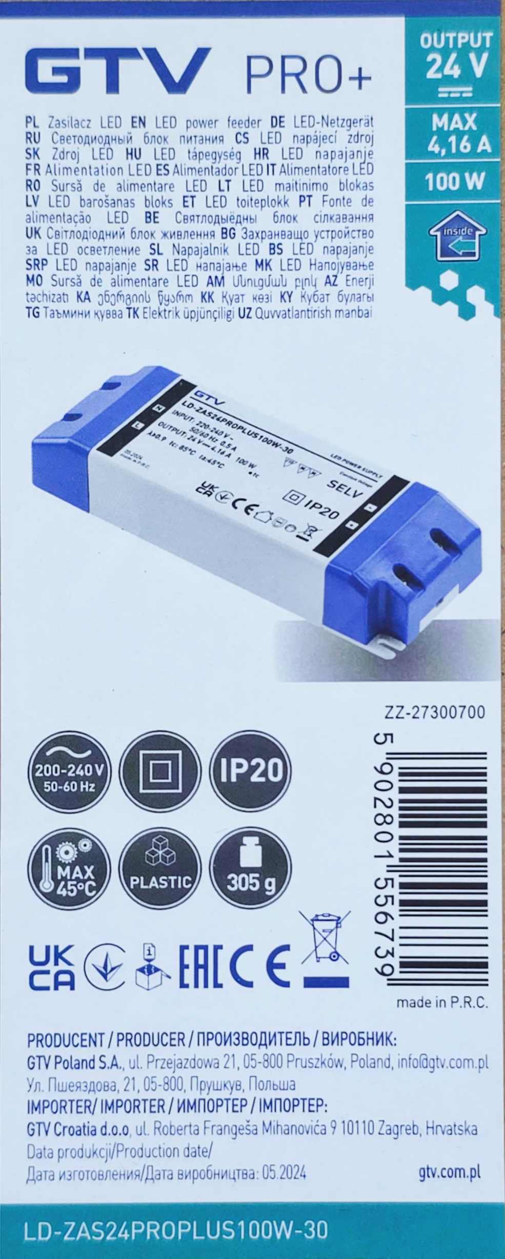 Detali informacija Kodas: 11319, Transformatorius LED DC 24V 100W IP20 4.16A PVC korp GTV LD-ZAS24PROPLUS100W-30