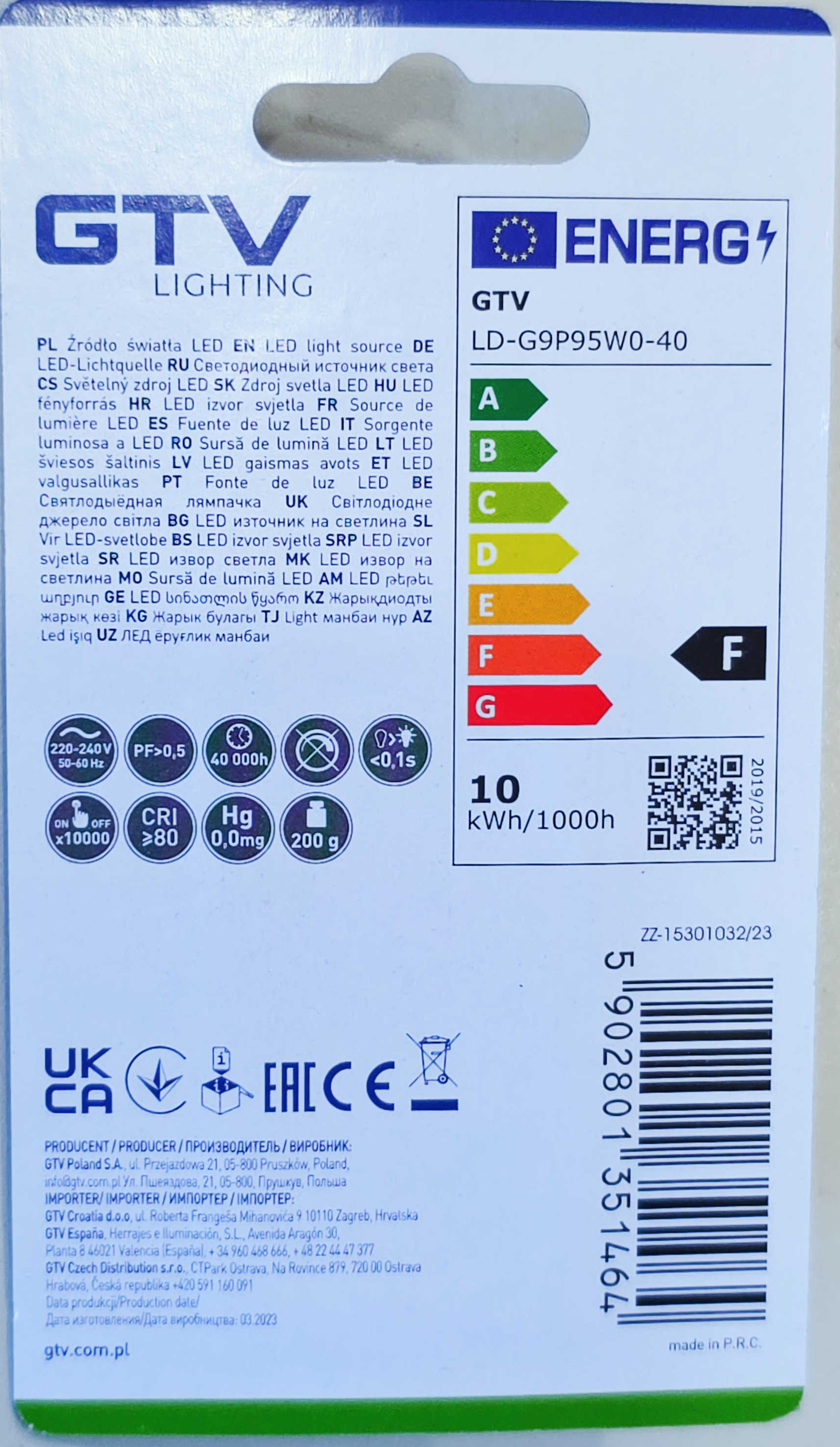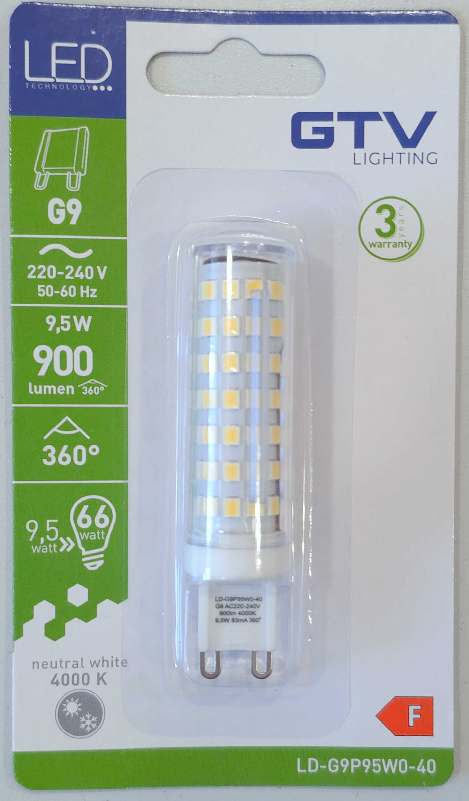 Detali informacija Kodas: 11343, Lempa LED 9.5W 220V G9 900lm 4000K GTV LD-G9P95W0-40 (LL40046)