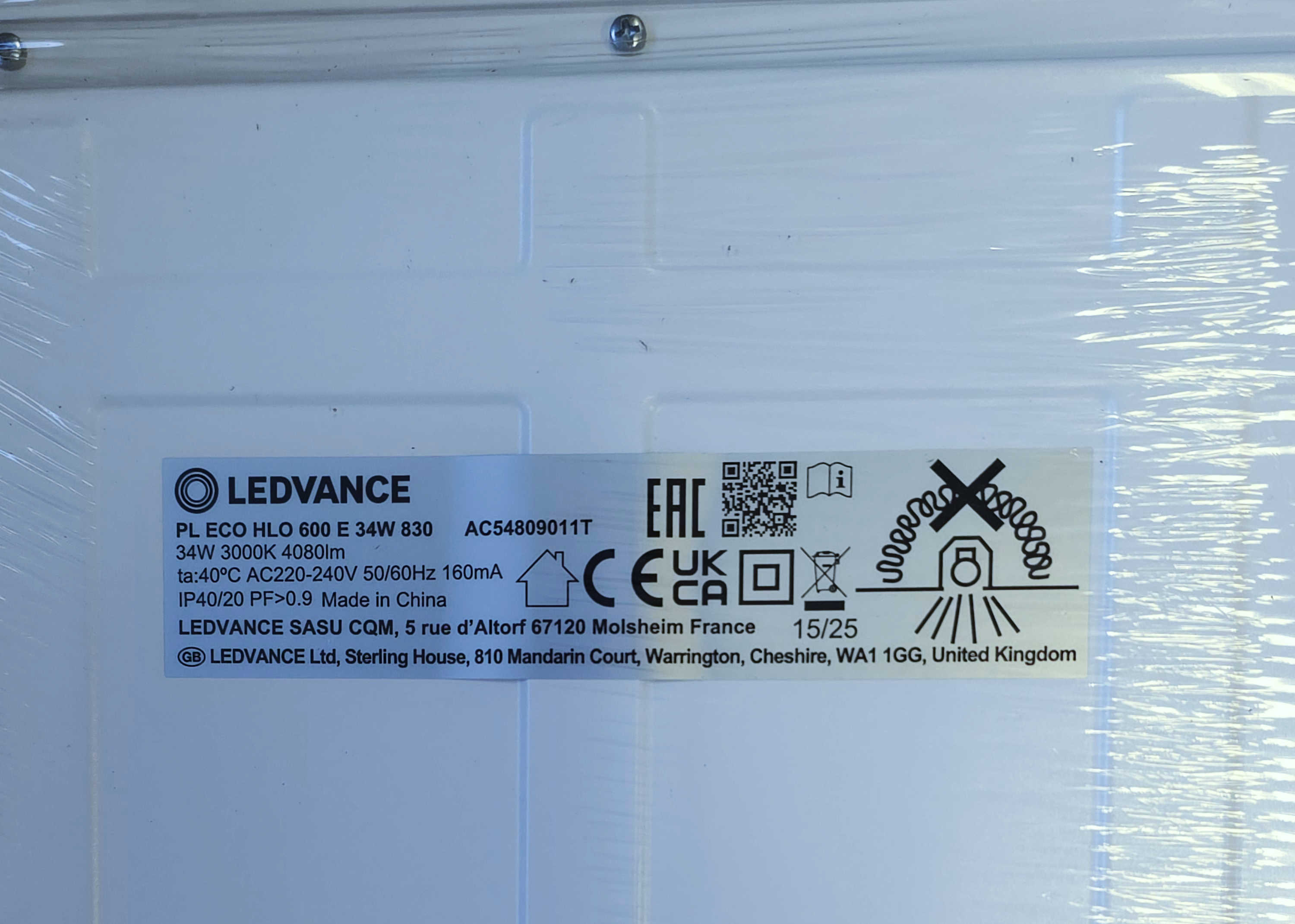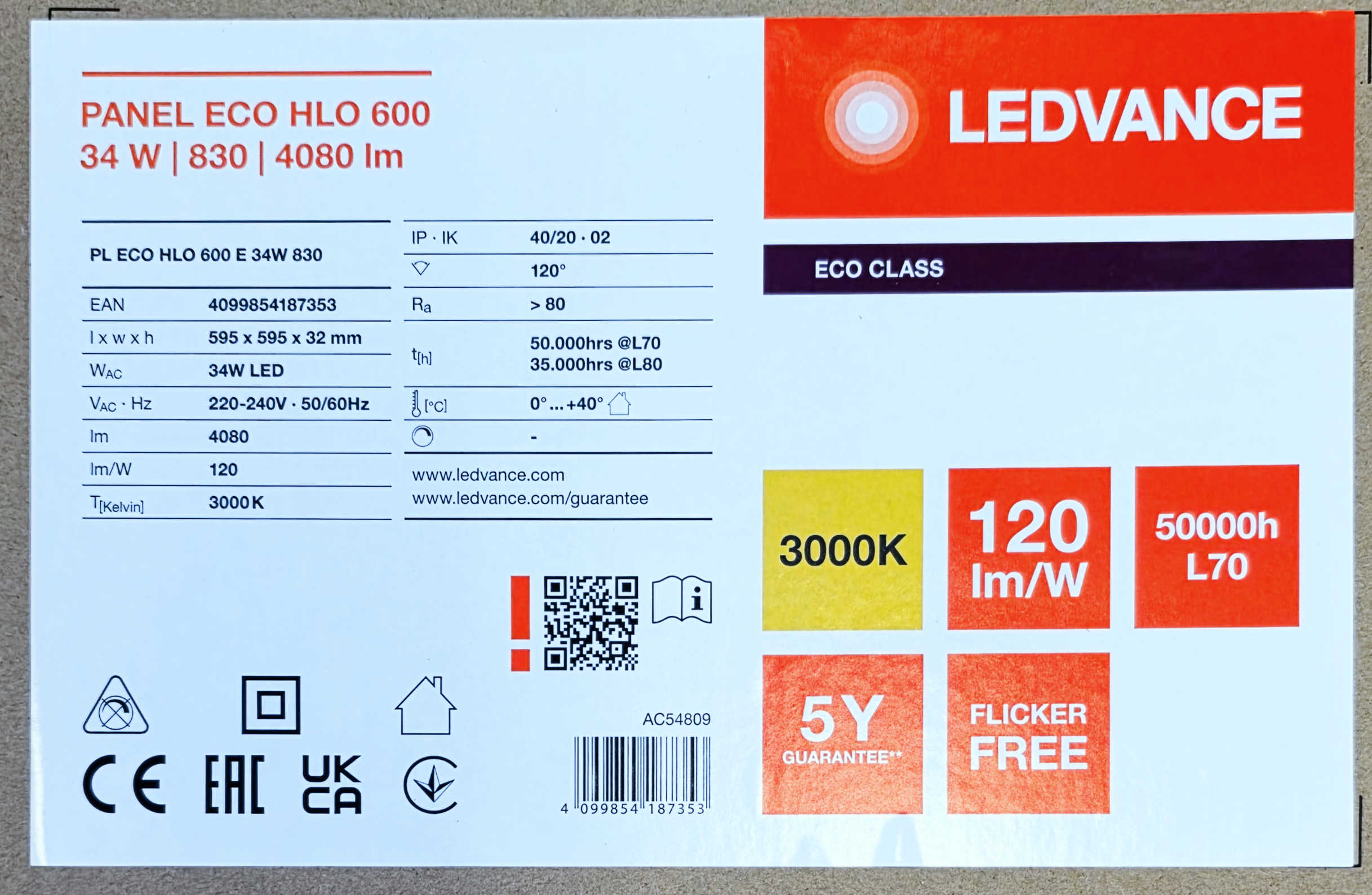 Detali informacija Kodas: 11345, Šviest. LED Skydas įl 34W 60x60 keturk 4080lm 3000K Amstrong luboms Ledvance ECO HLO 600 su maitinimo šaltiniu (LED95807)(6)