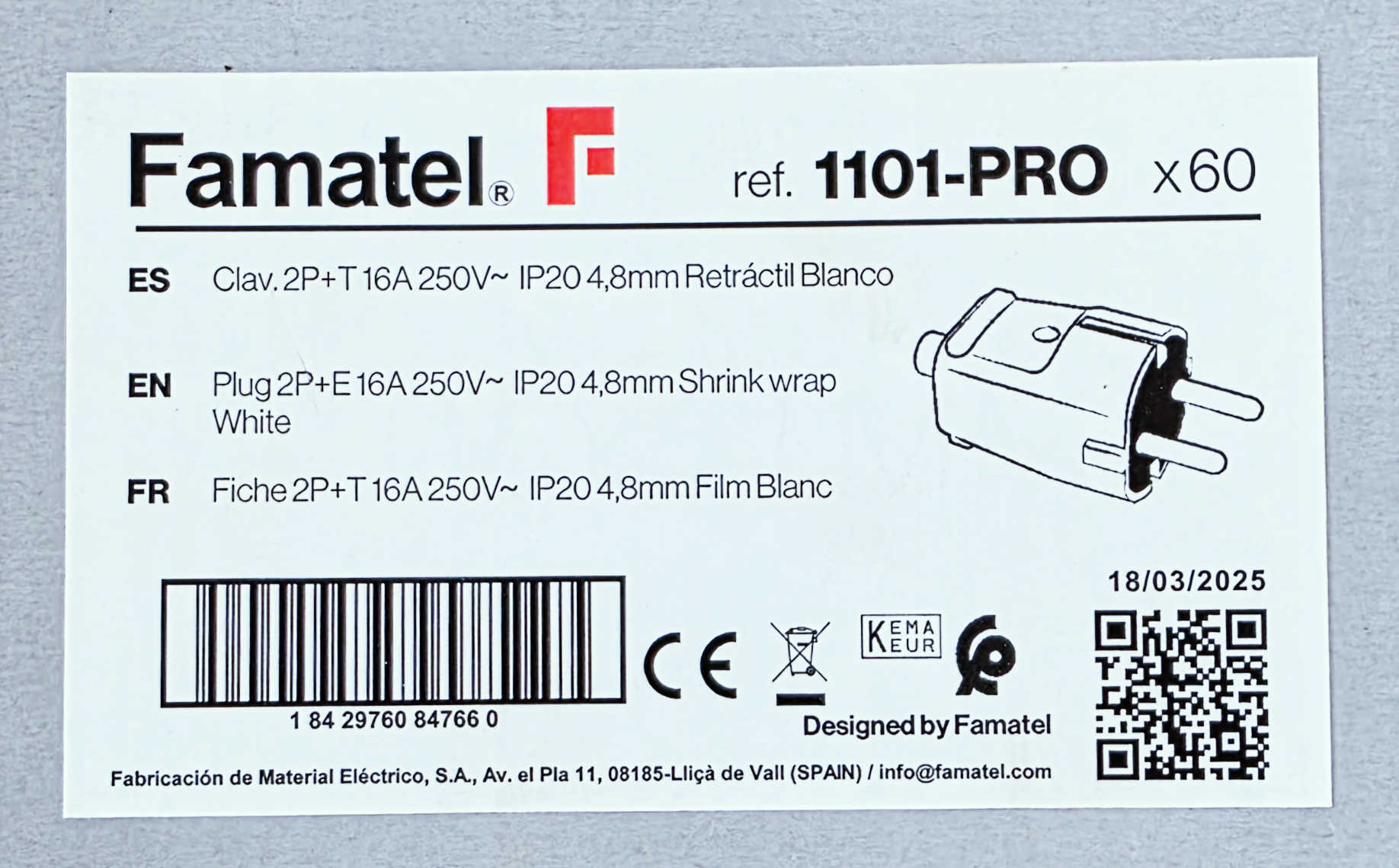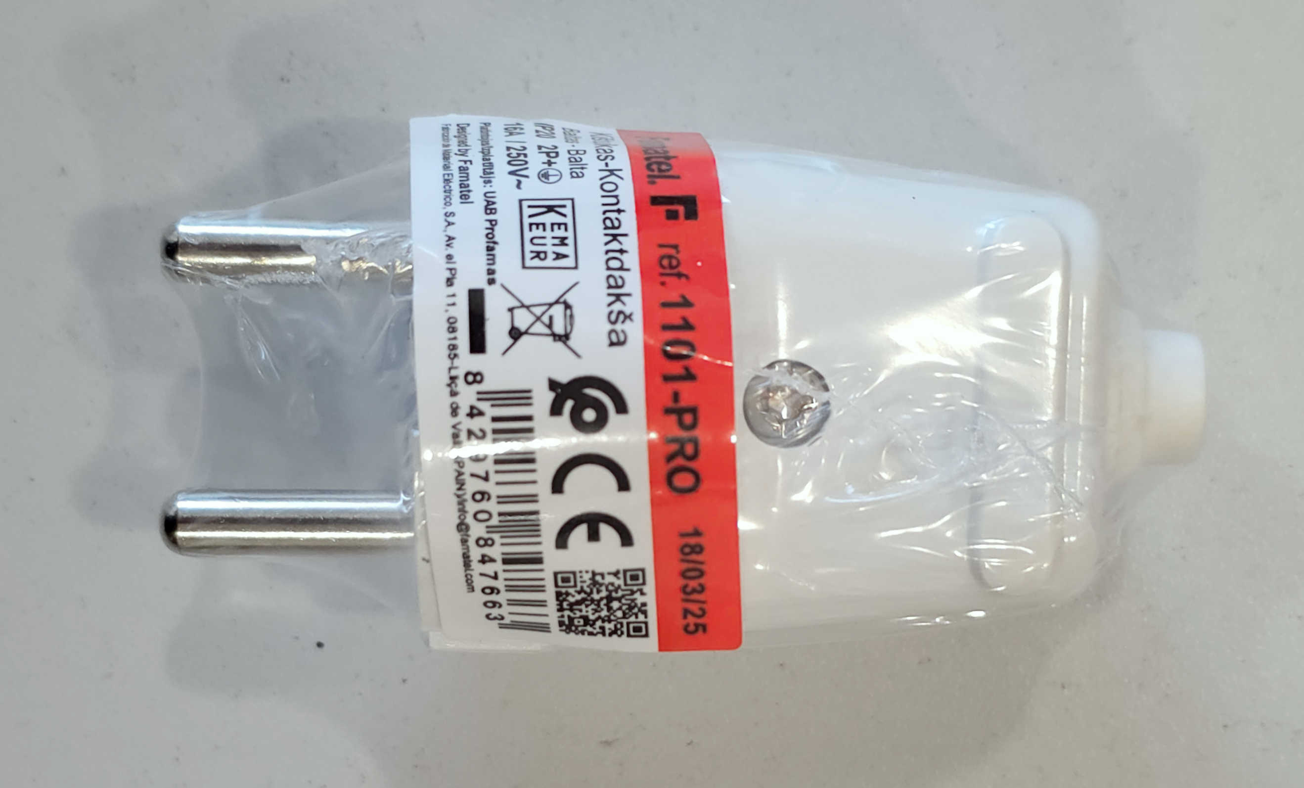 Detali informacija Kodas: 11368, Šakutė su įž. 16A BALTA laidas tiesiai 1101 Famatel (8429760847663)(60)