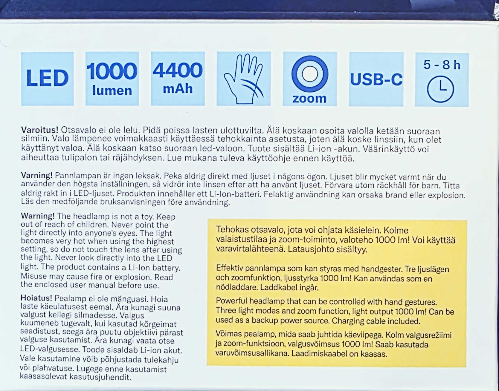 Detali informacija Kodas: 11386, Žibintas ant galvos 1000lm 4400mAh įkraun USB-C rankos mostu gesinamas XHP50 Airam (0104762)