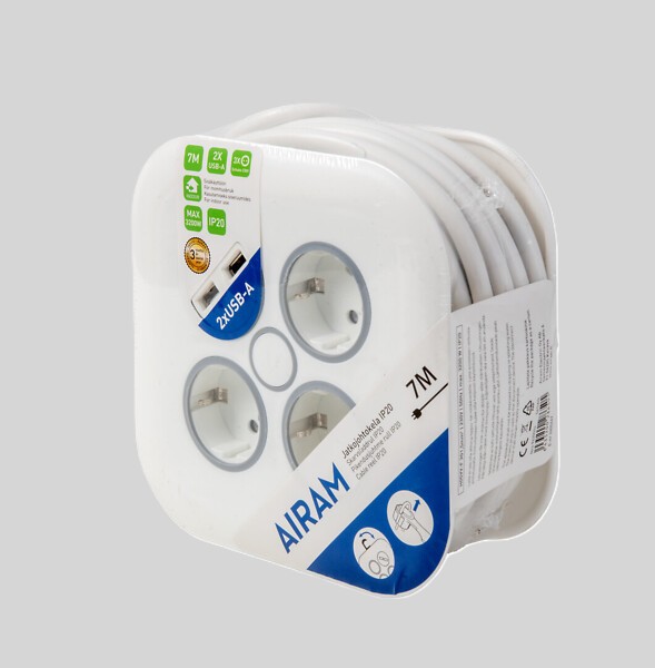 Detali informacija Kodas: 11390, Prailg. 7m 3x1.5mm² 3V + įkroviklis viduje 2xUSB-A 2.4A IP20 Baltas (0506339) AIRAM