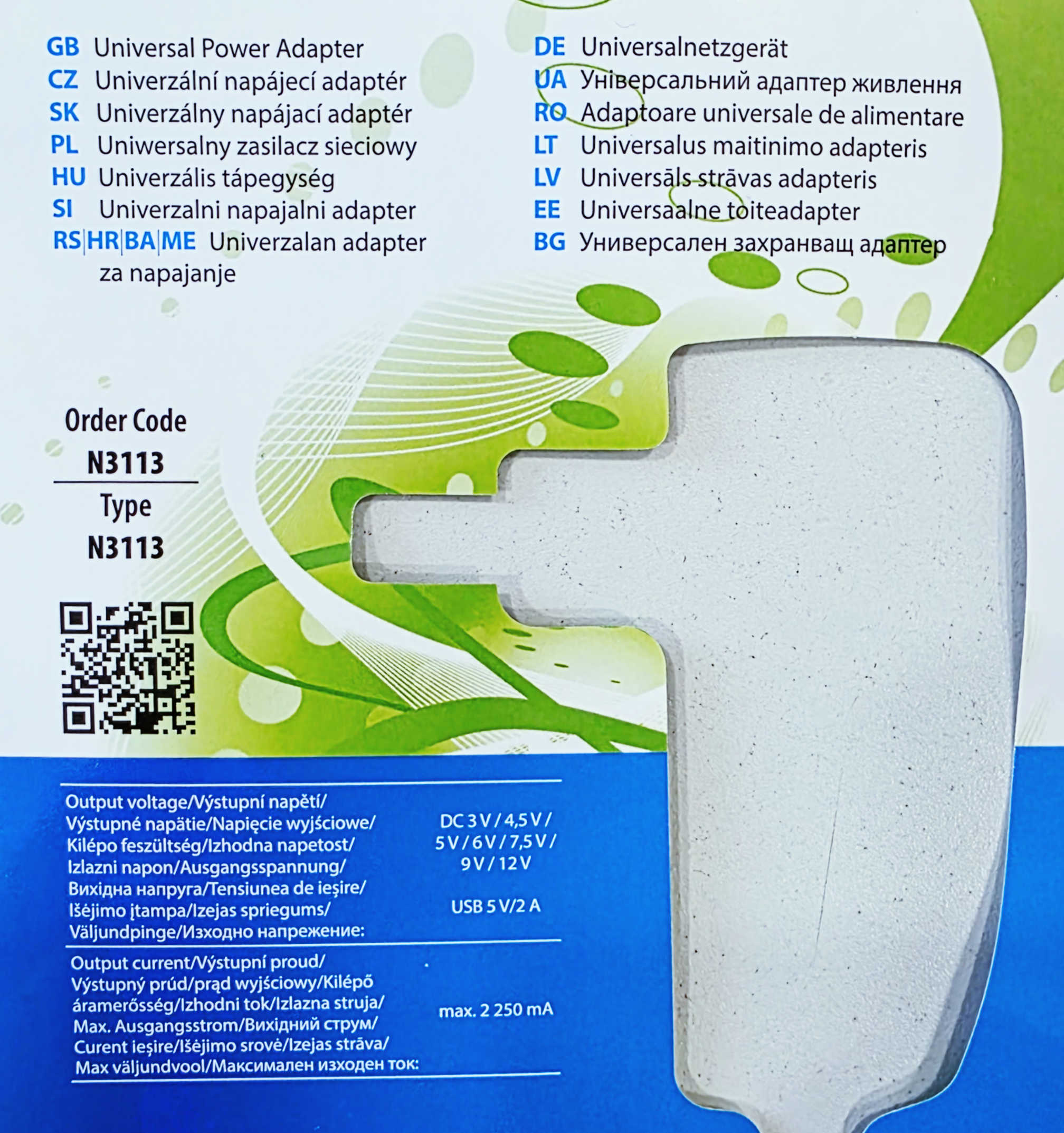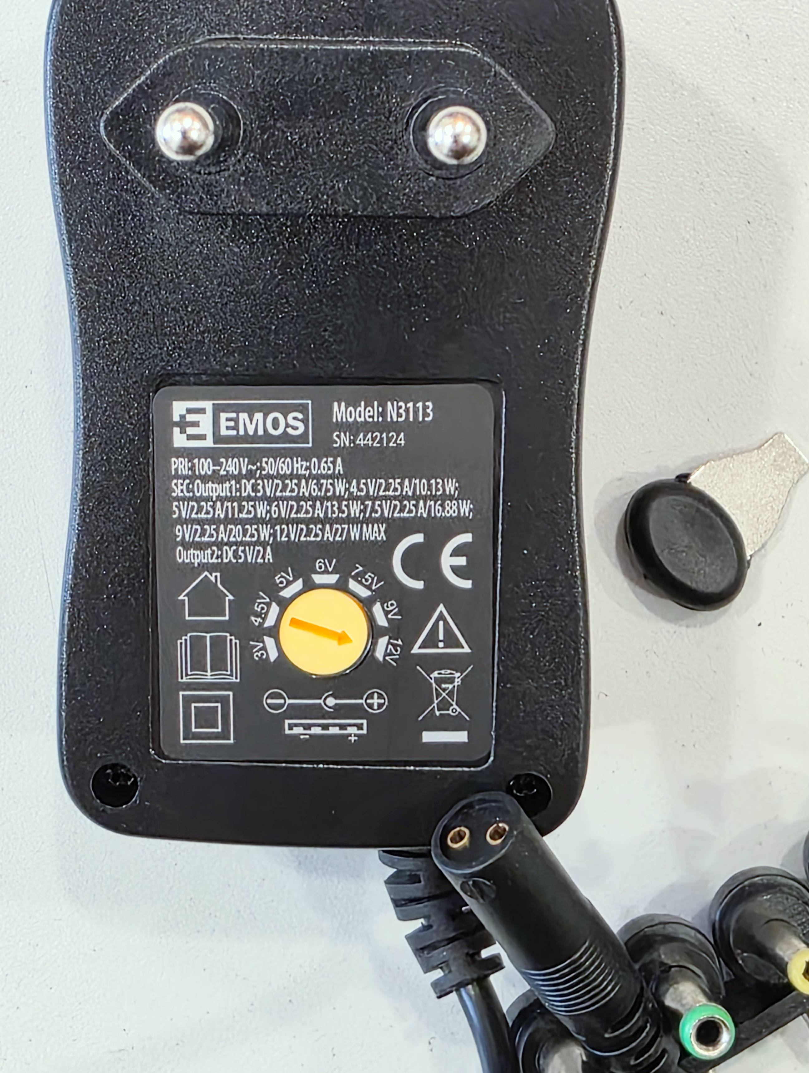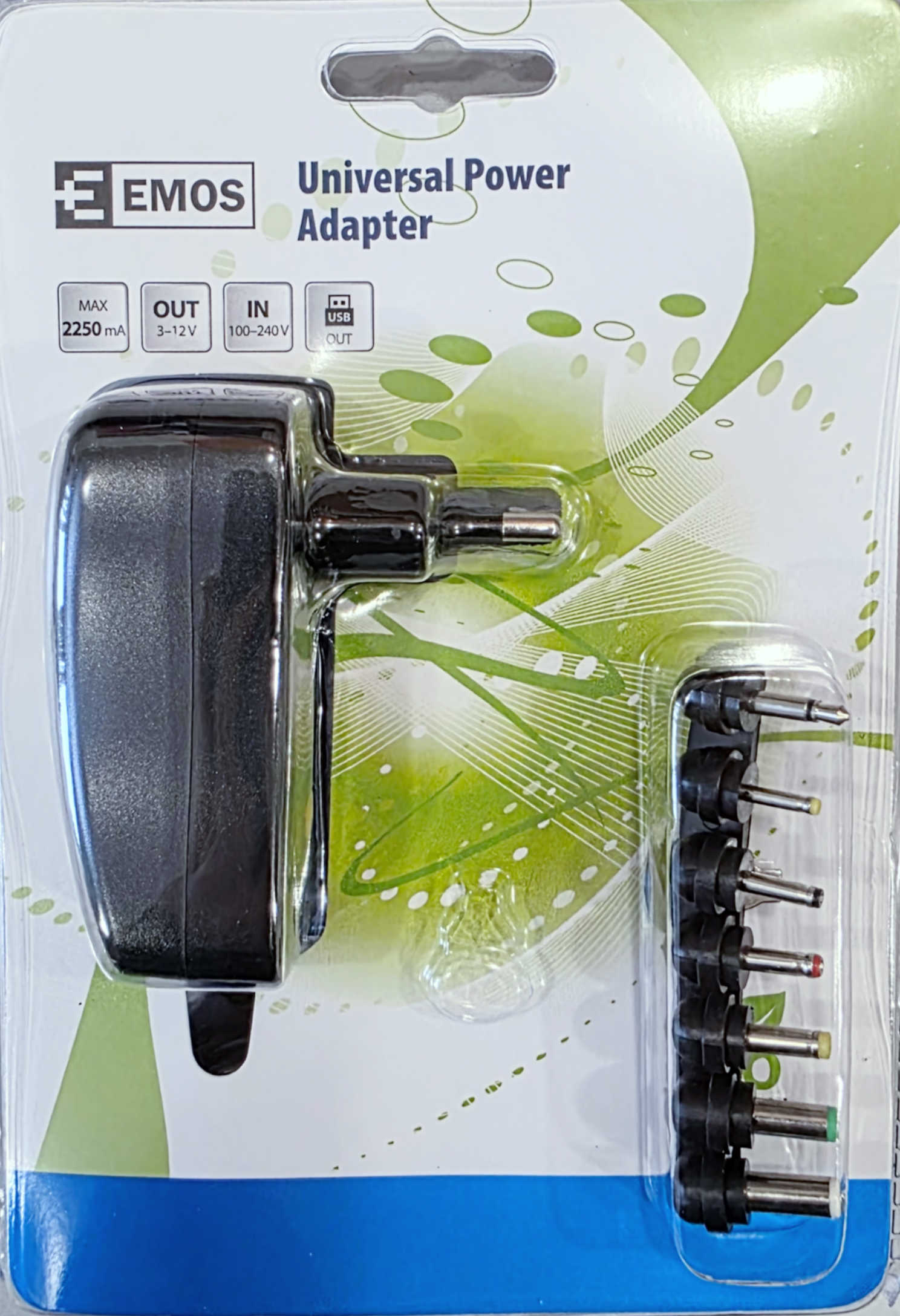 Detali informacija Kodas: 11395, Maitinimo šaltinis universalus 2.25A 3-12V su keičiamais antgaliais EMOS (N3113)
