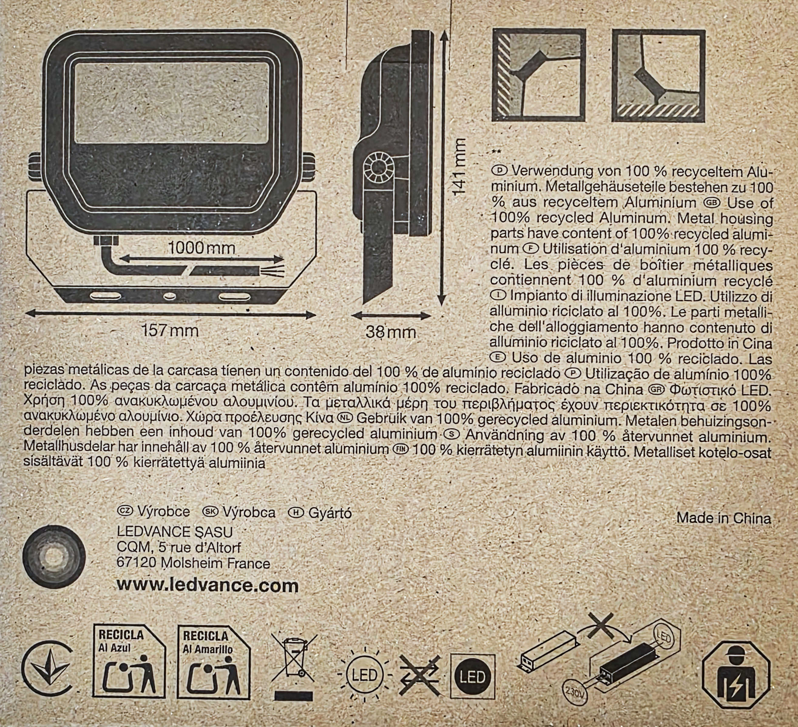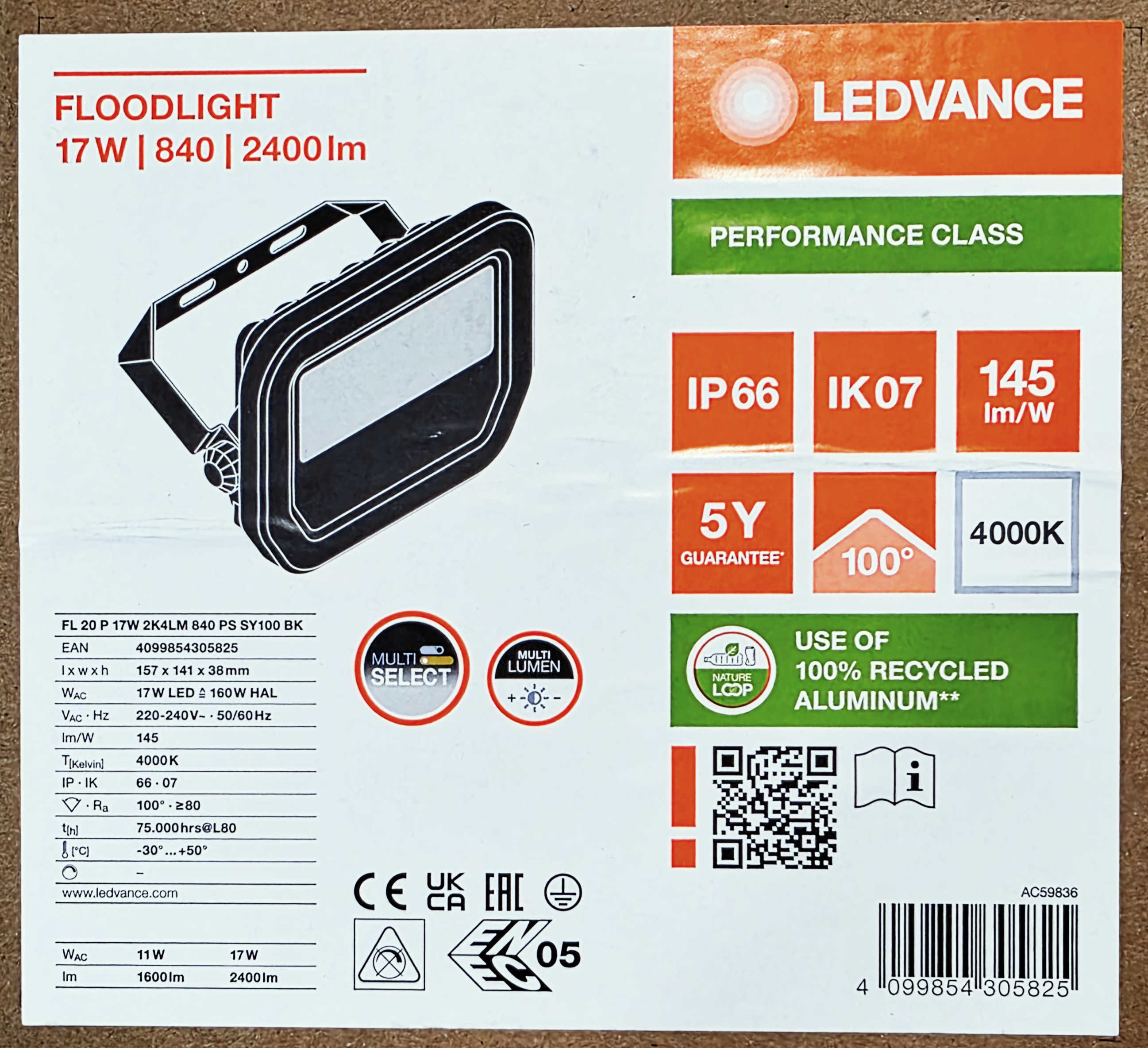 Detali informacija Kodas: 11401, Šviestuvas LED prožekt 17W-11W 4000K 2400lm 1600lm IP65 Flood LEDVANCE Juodas reguliuojama galia 2K4LM 840 PS SY100 BK (0104675)