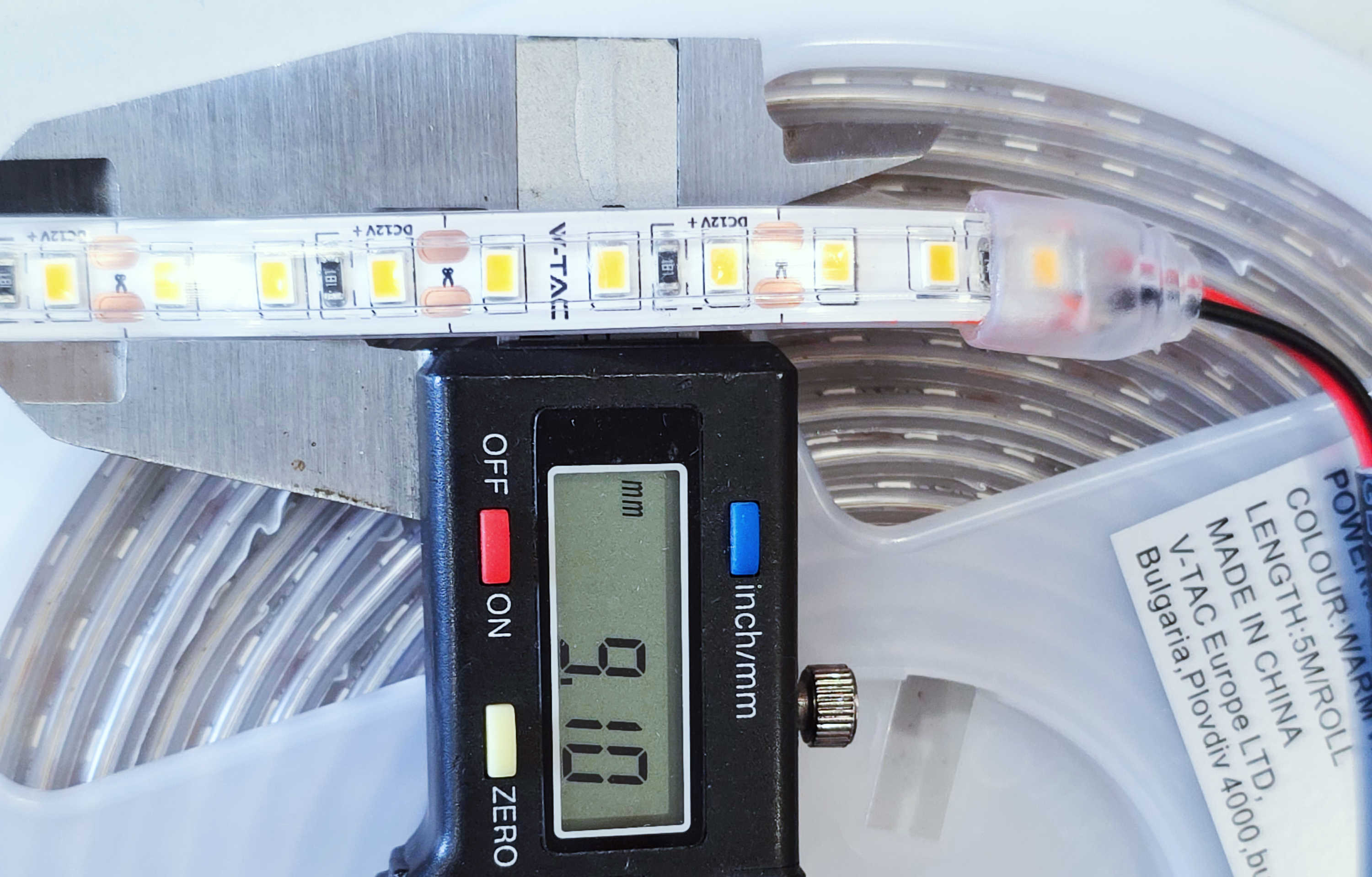 Detali informacija Kodas: 5613, Juosta LED 8W/1m 120LED/m 3000K IP65 800lm 12V SMD3528 (LED3297, 70901) V-TAC