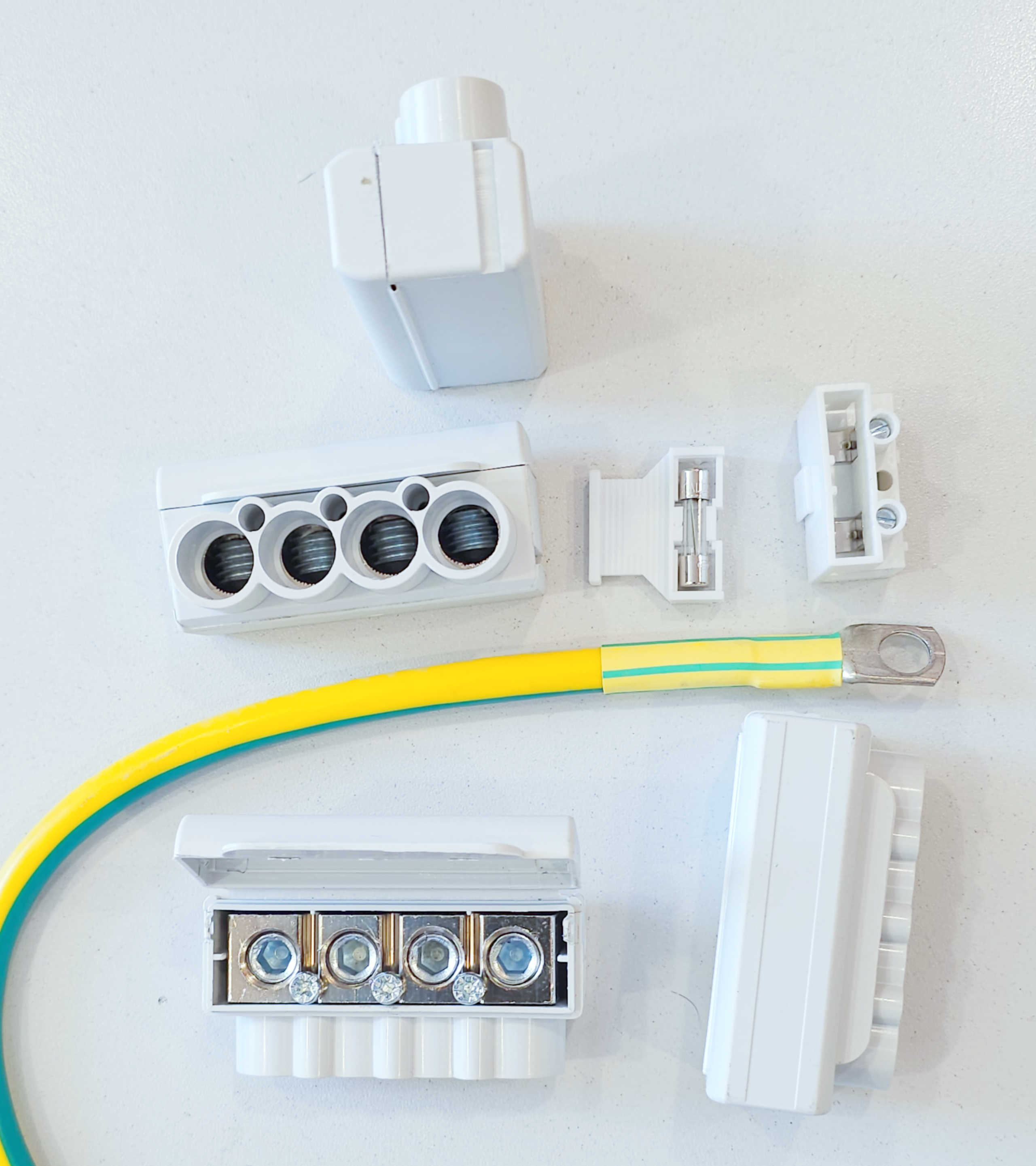 Detali informacija Kodas: 8333, Gnybtas sujung. Komplektas 4vnt: 4P 2.5-50mm² + 1vnt: 2.5mm² su 10A saugikliu ir laidu SV-15 (NSV-15)