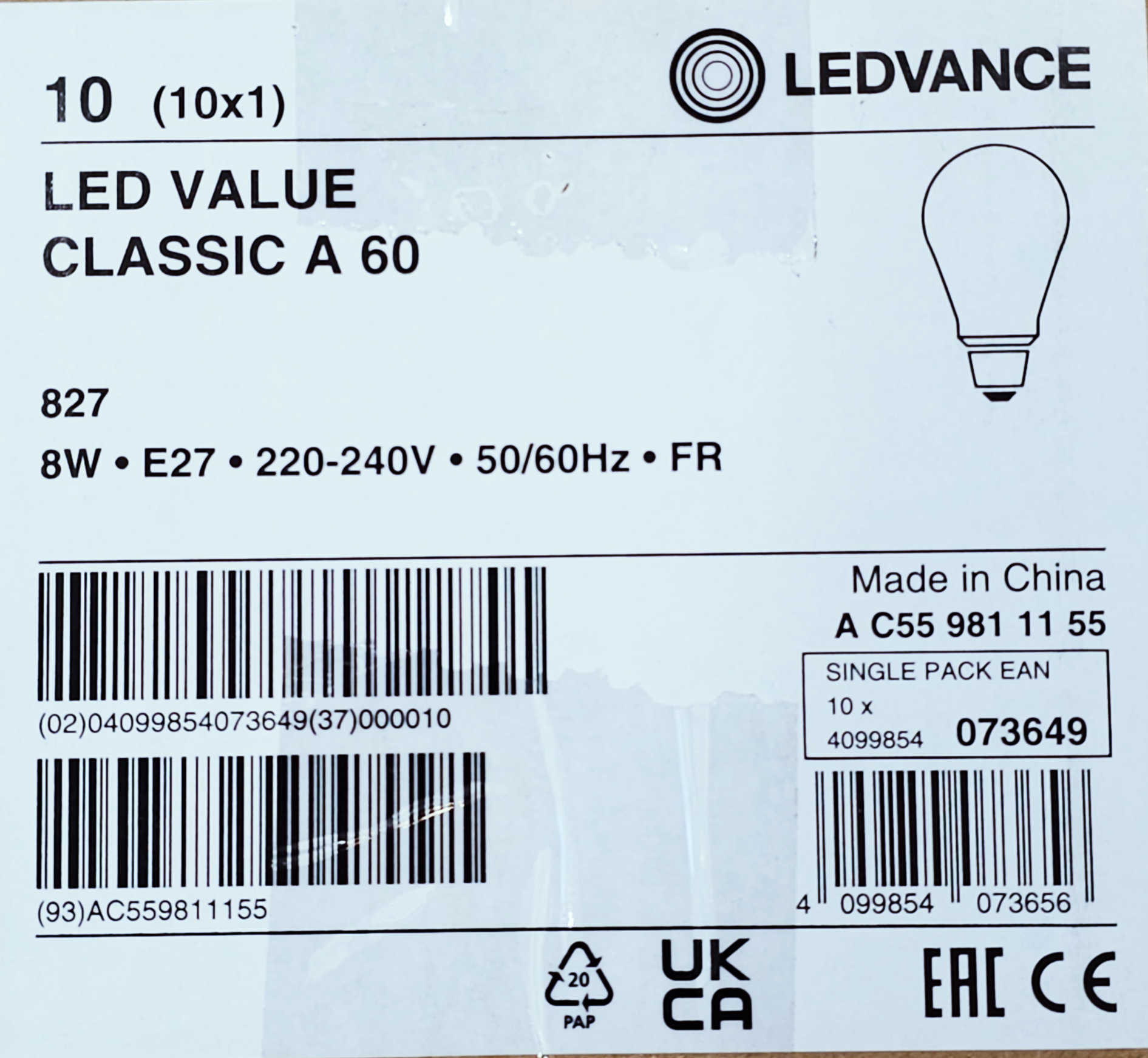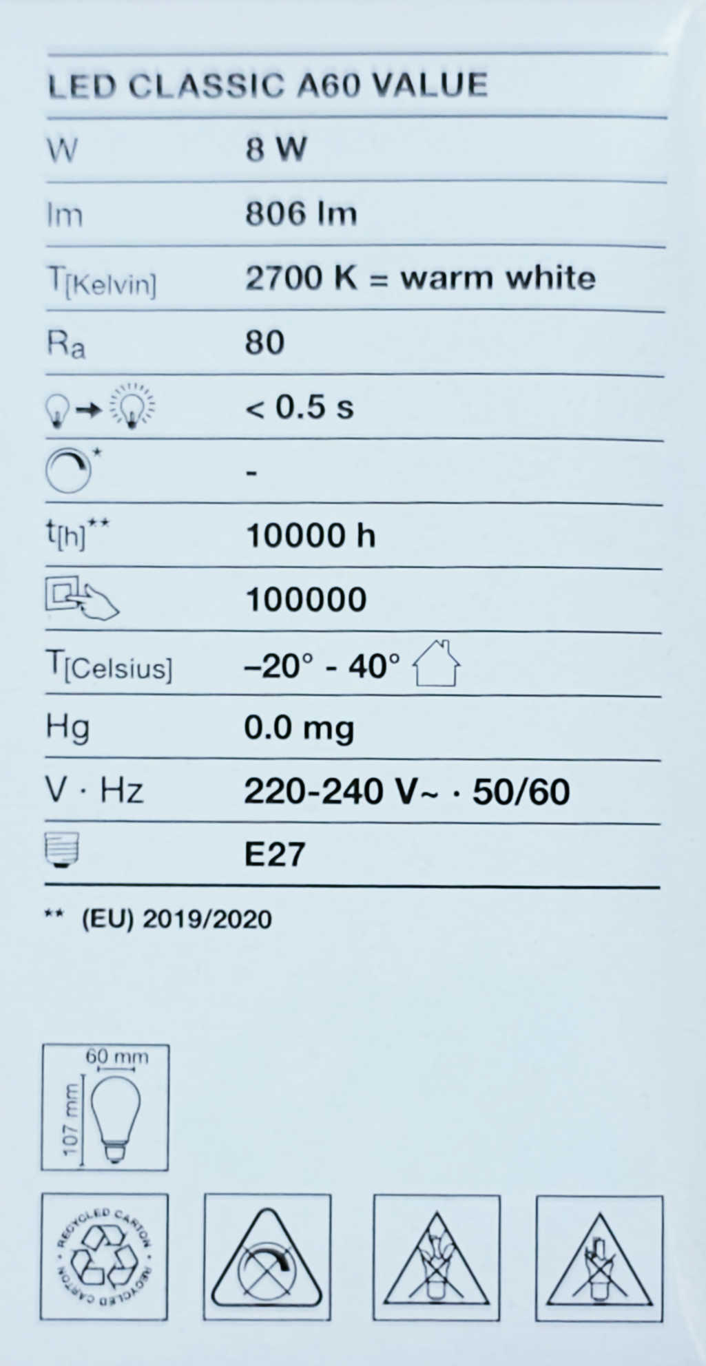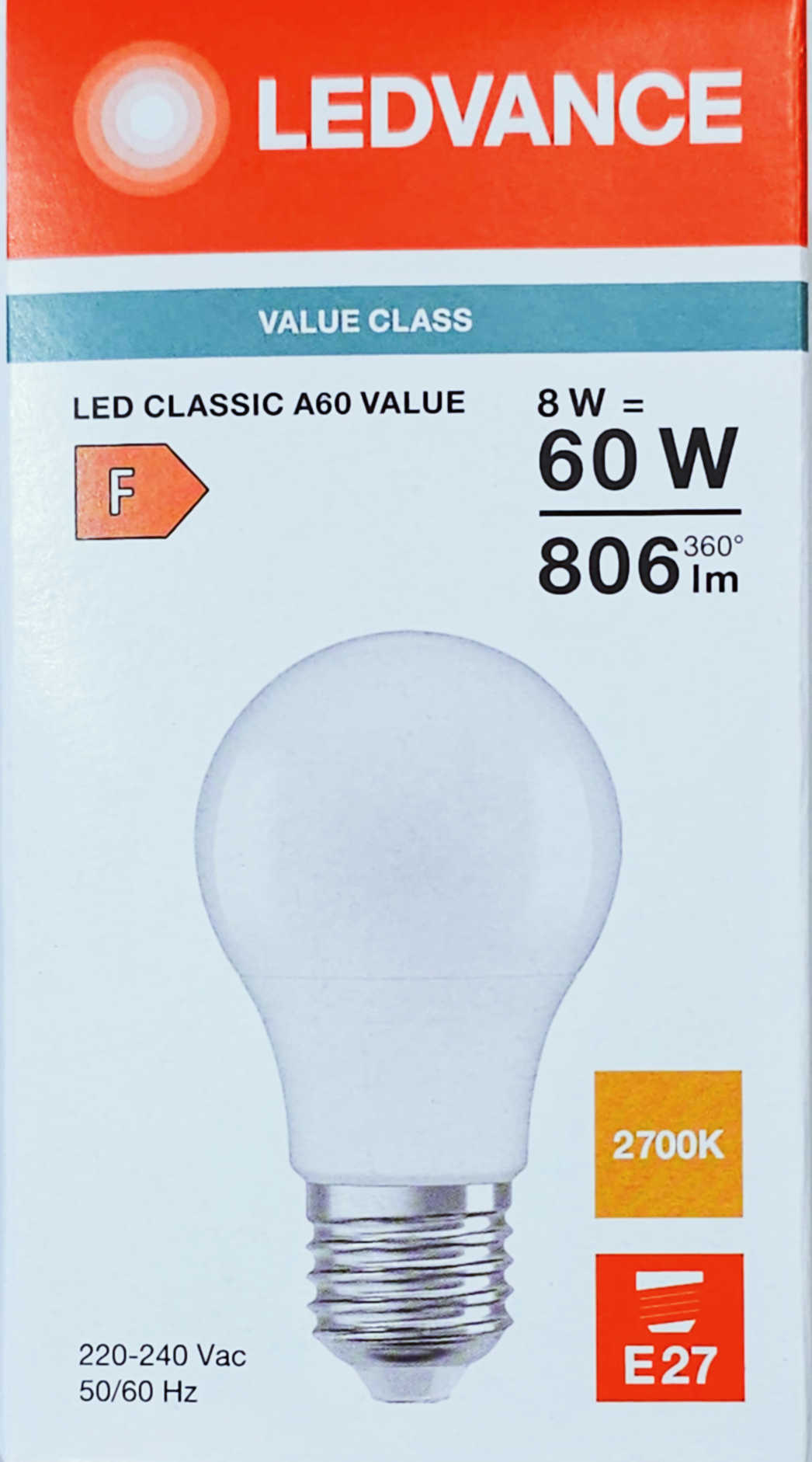 Detali informacija Kodas: 856, Lempa LED 8W E27 A60 2700K 806lm (LED109465) Ledvance (10)