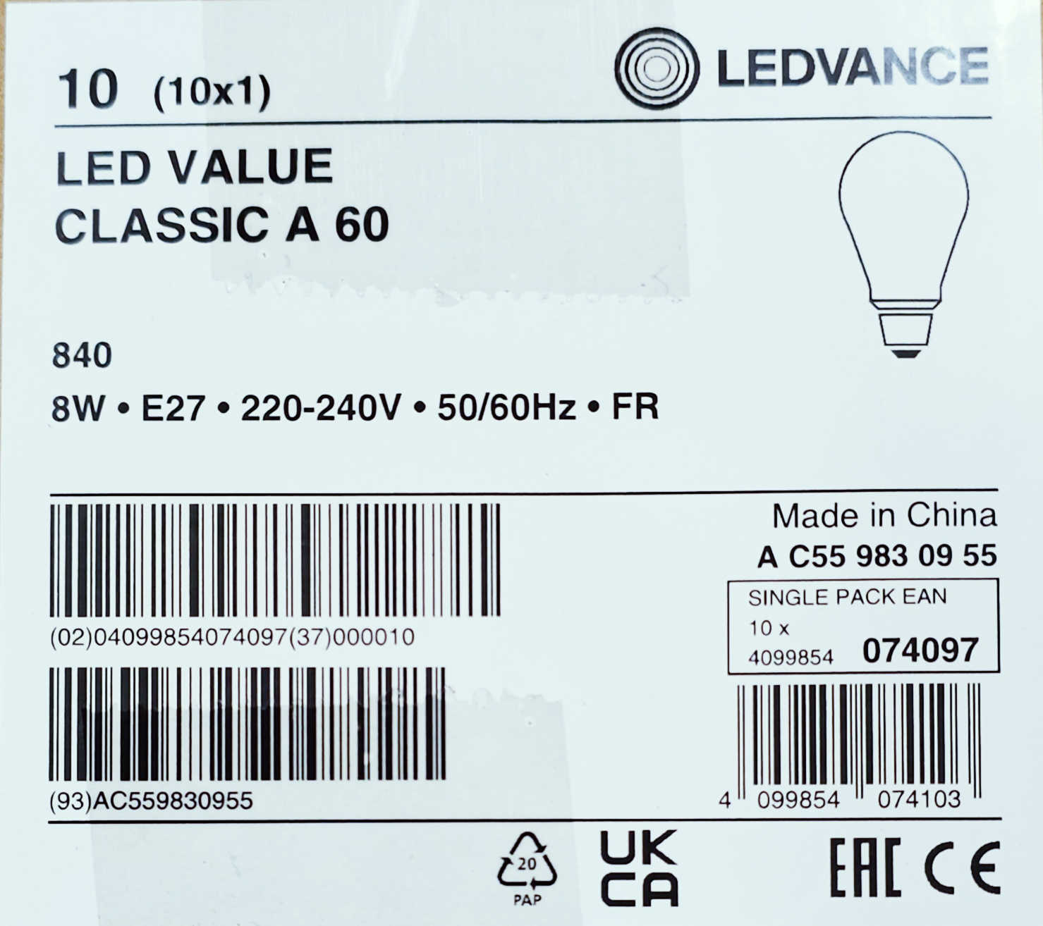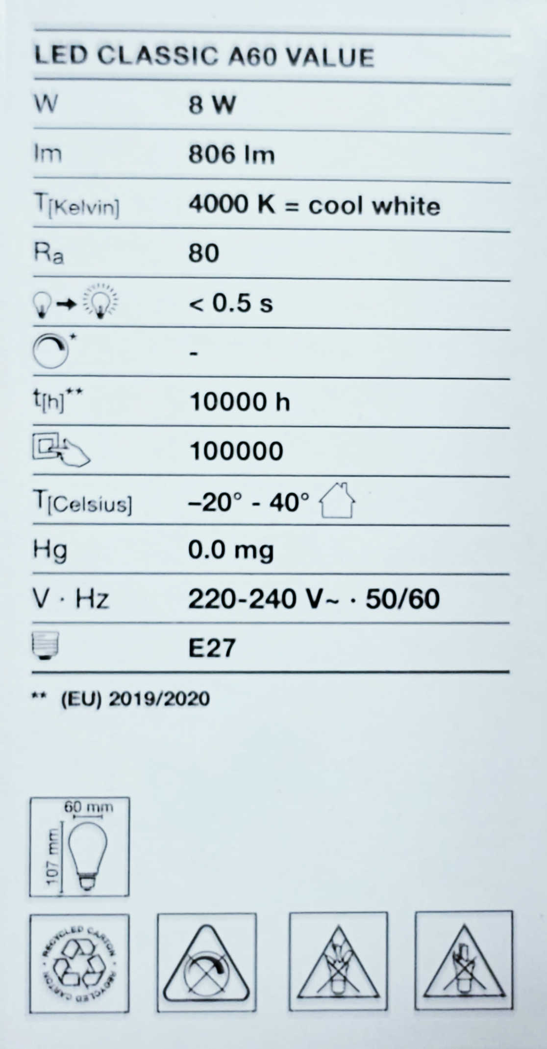 Detali informacija Kodas: 857, Lempa LED 8W E27 A60 4000K 806lm (LED109466) Ledvance(10)
