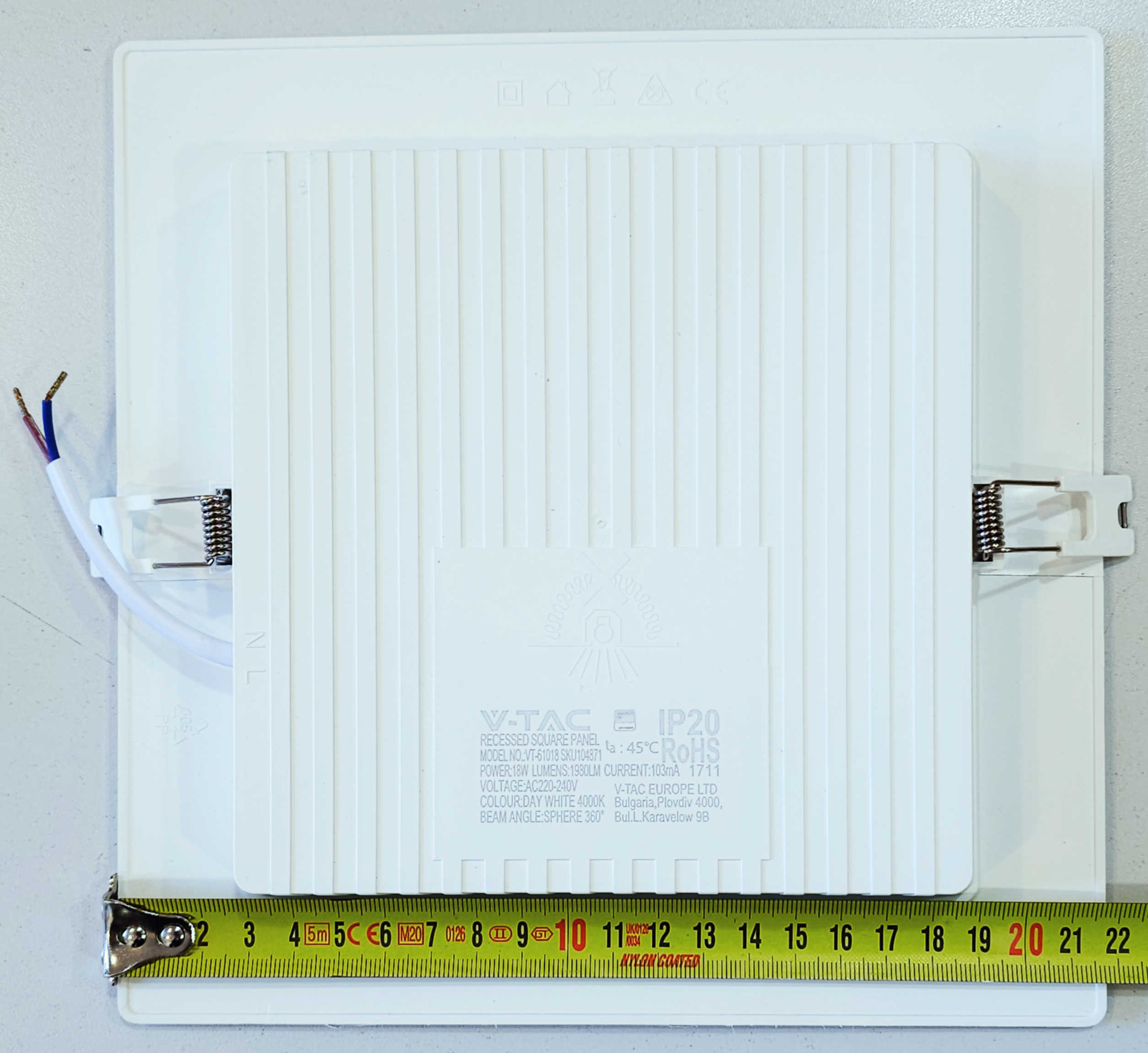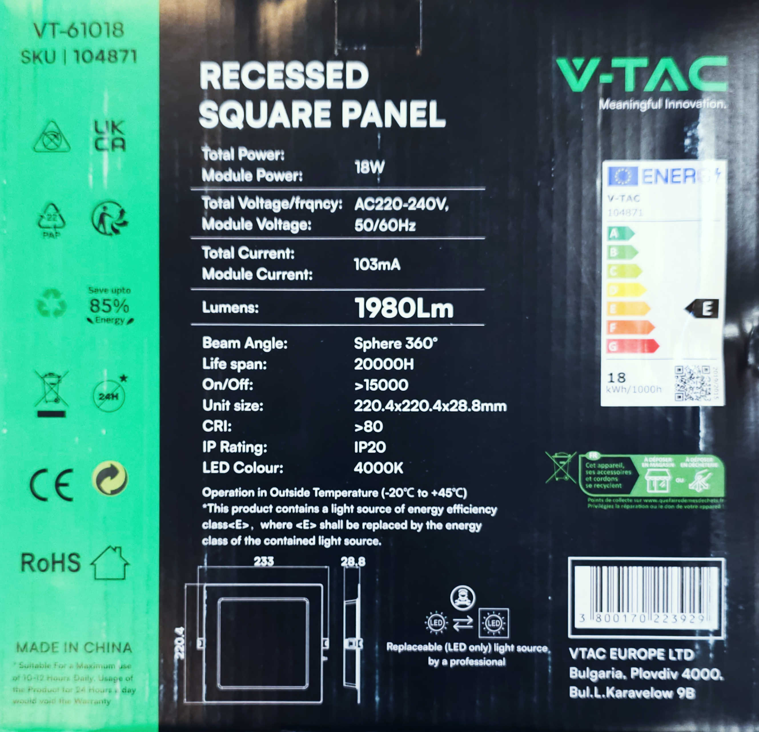 Detali informacija Kodas: 869, Šviest. LED Skydas įl 18W keturk 225x210mm 4000K/1980lm IP20 su šaltiniu V-TAC VT-61018 Samsung chip (LED104605)