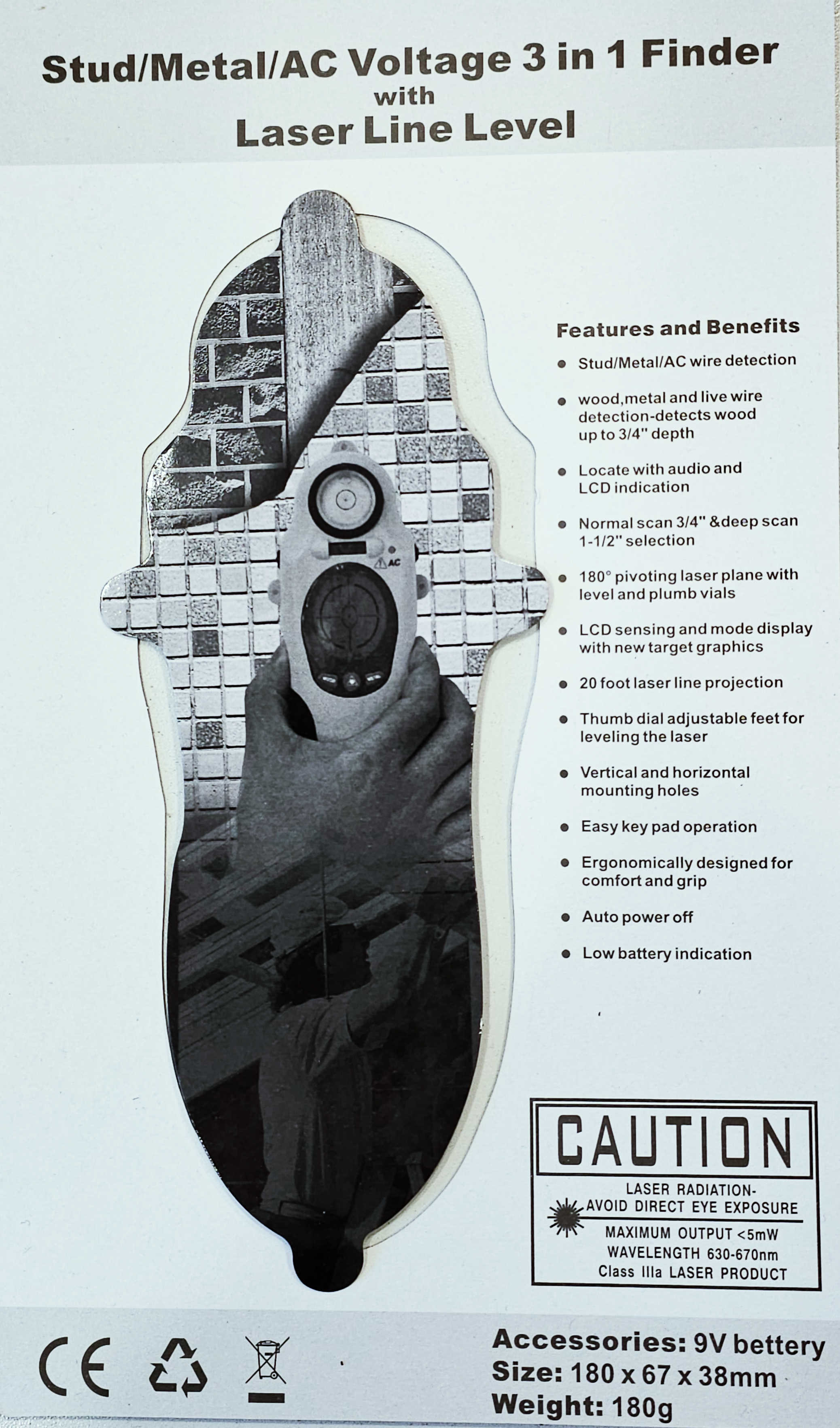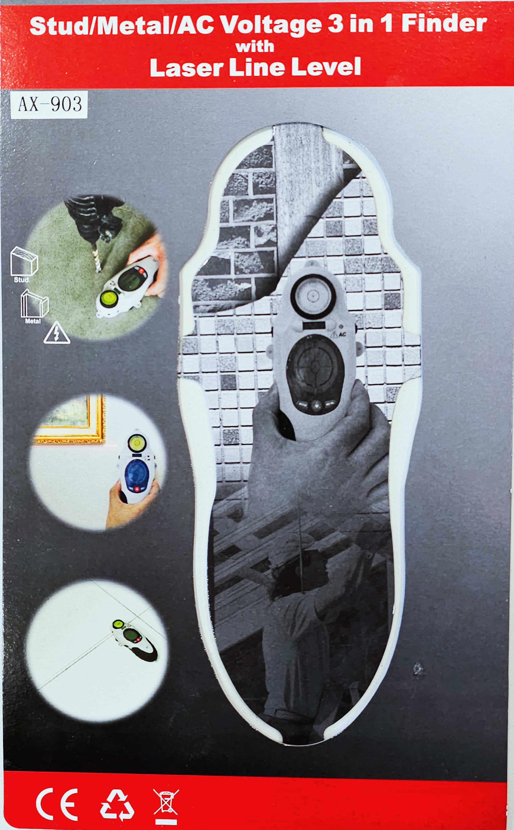 Detali informacija Kodas: 881, Ieškiklis laidų, metalų, medienos su gulsčiuku ir lazer AX-903