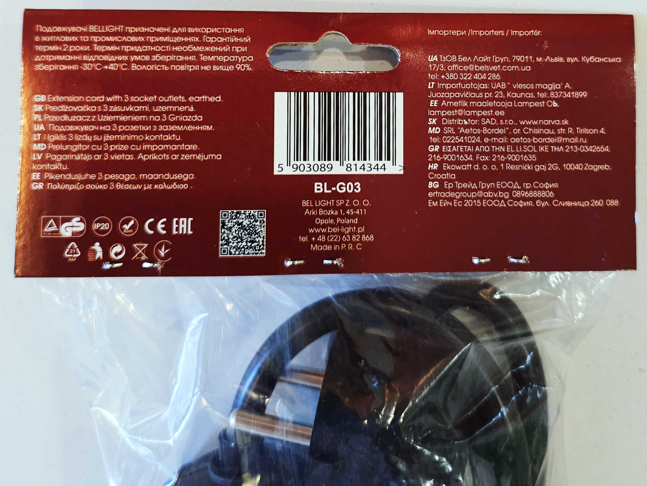 Detali informacija Kodas: 9981, Prailg. 1.5m 3V s/ž 3x1,5 Juodas Bellight (5903089814344)