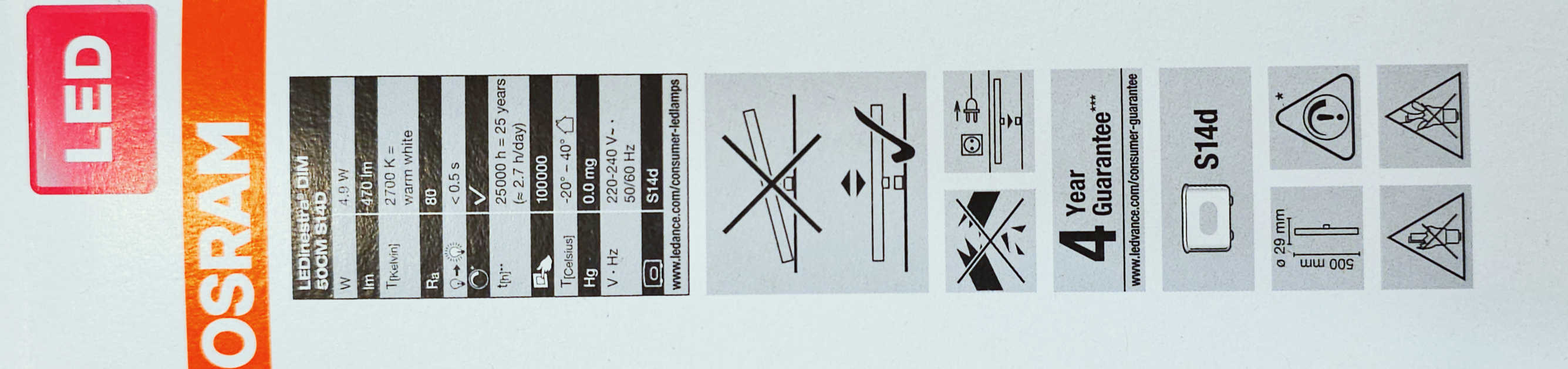 Detali informacija Kodas: 9989, Lempa LED Ledinestra 4.8W/2700K mat. 470lm S14d 1BAZ (50 cm) Osram (AC33896001D)